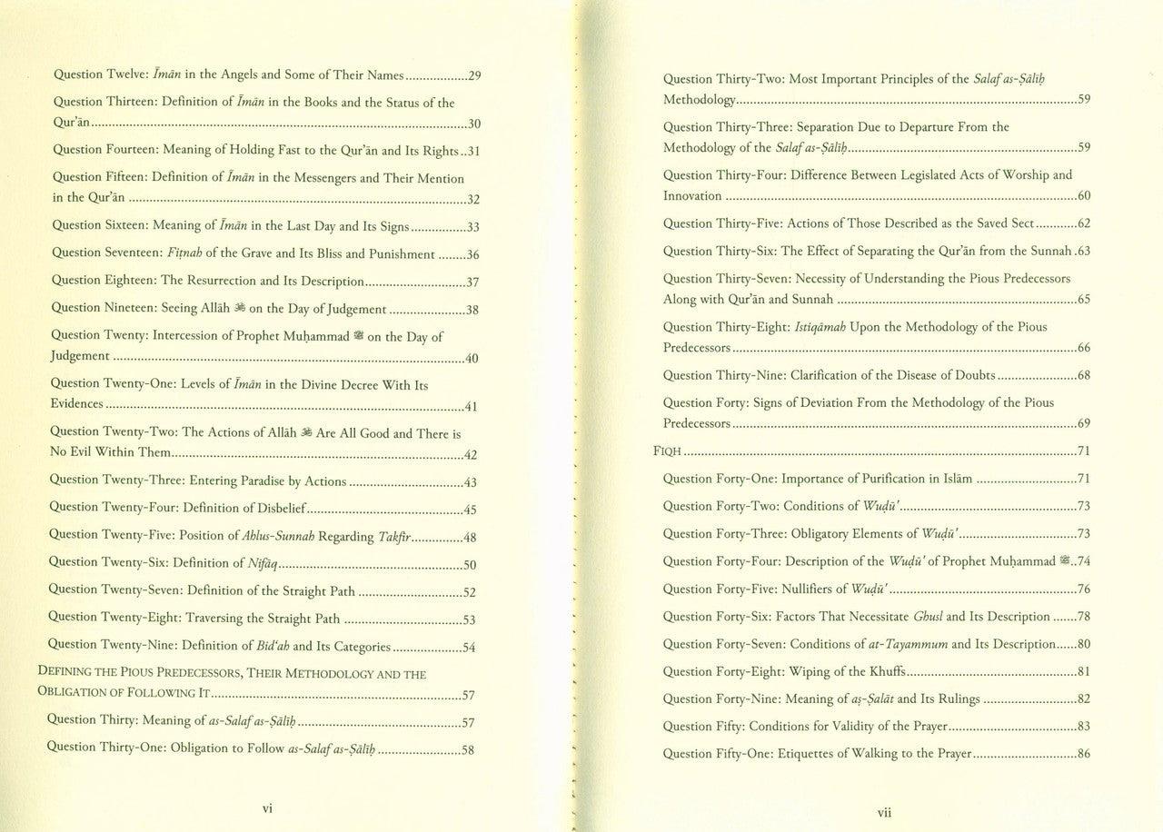 It is a two-part compilation of answers to questions regarding aqidah and fiqh. The aqidah collection contains questions and answers regarding all aspects of aqidah. The fiqh collection contains questions and answers specific to purification and prayer; including the congregational prayer, Friday prayers, the two Eid prayers, the prayer for seeking rain, the eclipse prayer, and washing the deceased.