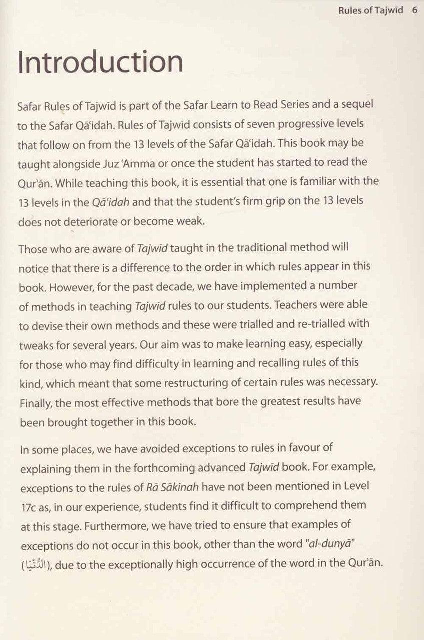 Rules of Tajwīd, is a sequel to the Safar Qāʿidah and part of the comprehensive Safar Learn to Read Series. This book consists of seven progressive levels, each targeting a unique feature of learning, which follow on from the 13 levels of the Safar Qāʿidah. It may be taught alongside Safar Juz ʿAmma or while a student starts to read the Qurʾān.