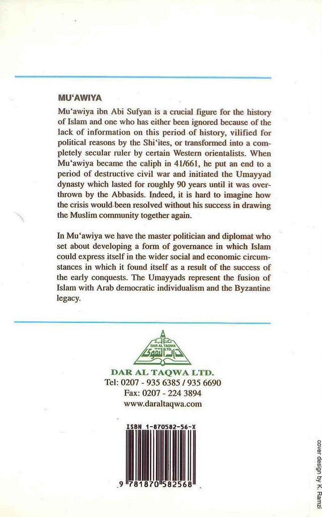 SL: 013 / SL: 014 Mu'awiya ibn Abi Sufyan is a crucial figure for the history of Islam and one who has either been ignored because of the lack of information on this period of history, vilified for political reasons by the Shi'ites, or transformed into a completely secular ruler by certain Western Orientalist. When Mu'awiya became the caliph in 41/661, he put an end to a period of destructive civil war and initiated the Umayyad dynasty which lasted for roughly 90 years until it was overthrown by the Abbasids. Indeed, it is hard to imagine how the crisis would have been resolved without his success in drawing the Muslim community together again. In Mu'awiya, we have the master politician and diplomat who set about developing a form of governance in which Islam could express itself in the wider social and economic circumstances in which it found itself as a result of the success of the early conquests. The Umayyads reprsent the fusion of Islam with Arab democratic individualism and the Byzantime legacy?