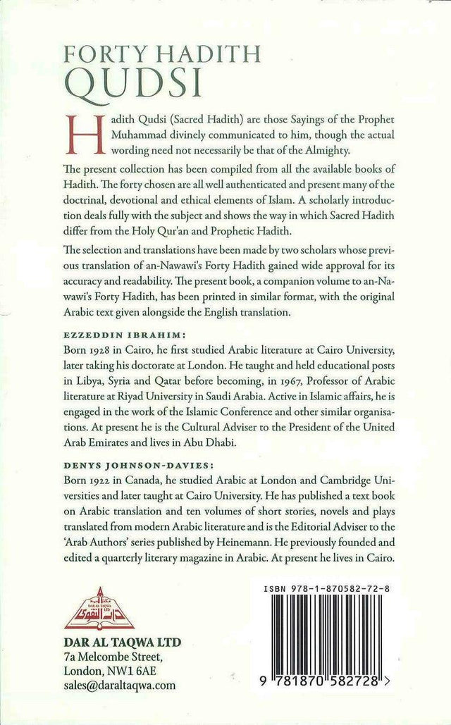 SL: 013 Hadith Qudsi (Sacred hadith) are those sayings of the Prophet Muhammad صلی الله علیهِ وآلهِ وسلم divinely communicated to him, though the actual wording need not necessarily be that of the Almighty. The present collection has been compiled from all the available books of hadith. The forty chosen are all well authenticated and present many of the doctrinal, devotional and ethical elements of Islam. A scholarly introduction deals fully with the subject and shows the way in which Sacred Hadith differ from the Holy Qur'an and Prophetic hadith. The selection and translations have been made by two scholars whose previous translation on an- Nawawi's forty hadith gained wide approval for its accuracy and readability. The present book, a companion volume to an- Nawawi's forty Hadith, has been printed in similar format, with the original Arabic text given alongside the English translation. EZZEDIN IBRAHIM: Born 1928 in Cairo, he first studied Arabic literature at Cairo University, later taking his doctorate at London. He taught and held educational posts in Libya, Syria and Qatar before becoming, in 1967, Professor of Arabic literature at Riyad University in Saudi Arabia. Active in Islamic affairs, he is engaged in the work of the Islamic Conference and other similar organisations. At present he is the Cultural advisor to the President of the United Arab Emirates and lives in Abu Dhabi. DENYS JOHNSON - DAVIES: Born in 1922 in Canada, he studied Arabic at London and Cambridge Universities and later taught at Cairo University. He has published a text book on Arabic translation and ten volumes of short stories, novels and plays translated from modern Arabic literature and is the Editorial Adviser to the 'Arab Authors' series published by Heinemann. He previously founded and edited a quarterly literary magazine in Arabic. At present he lives in Cairo.