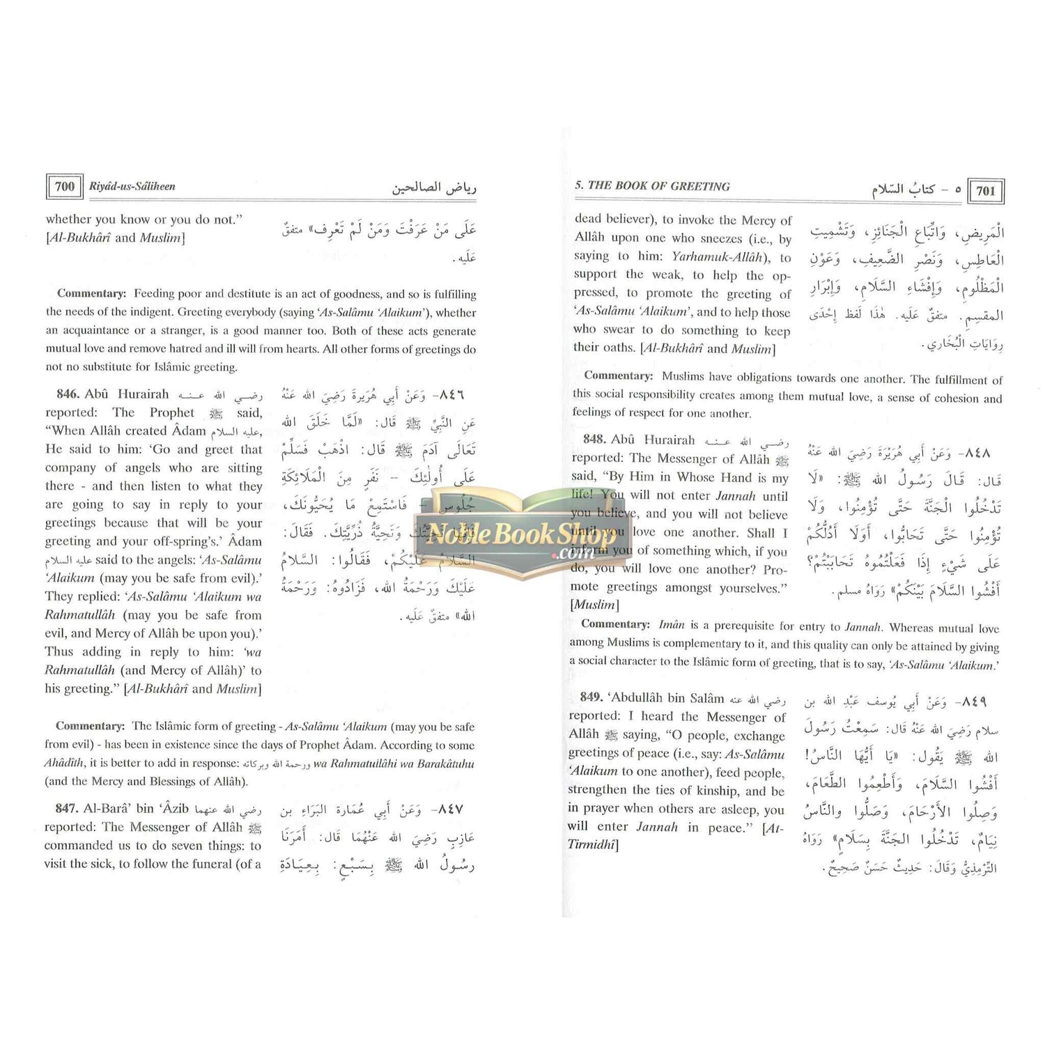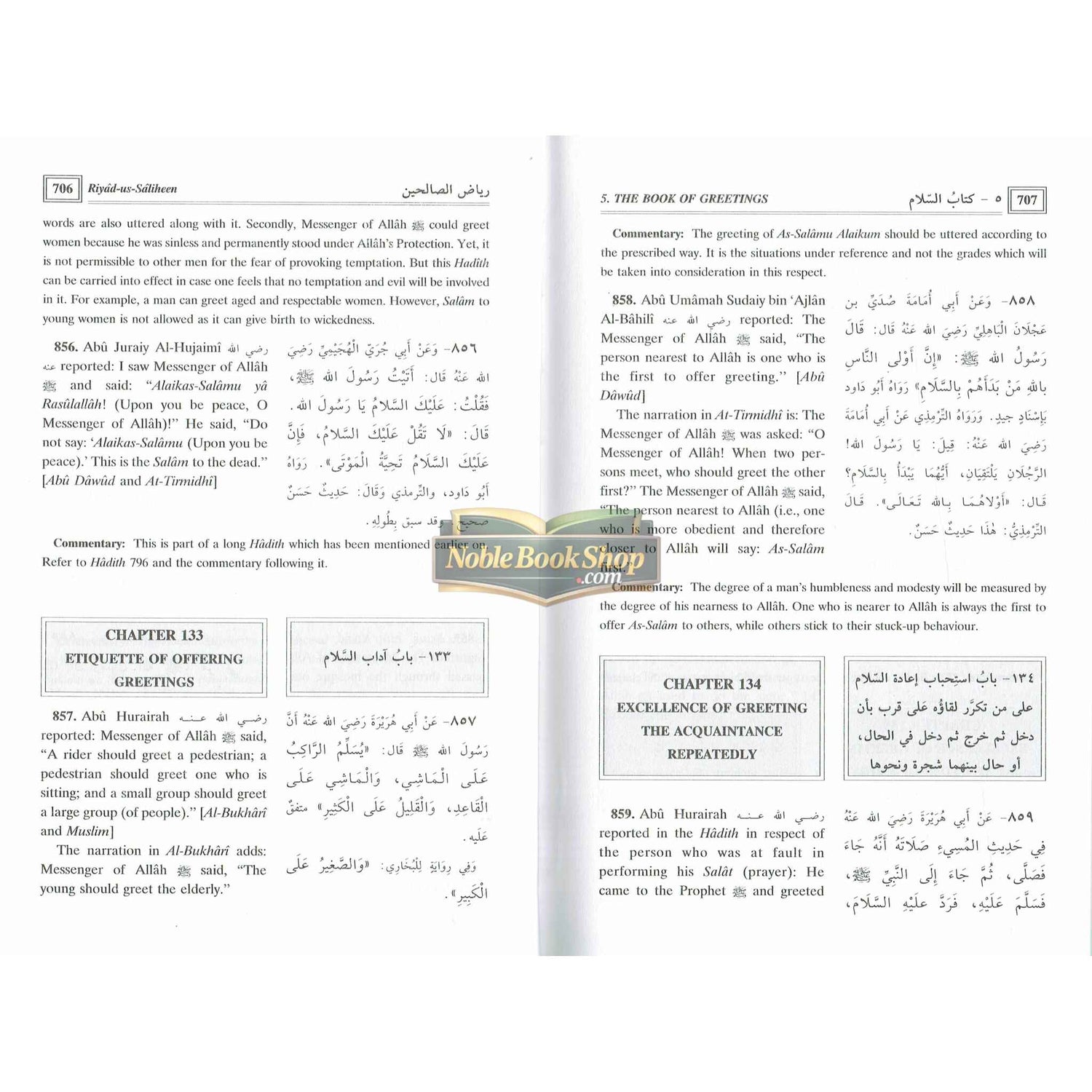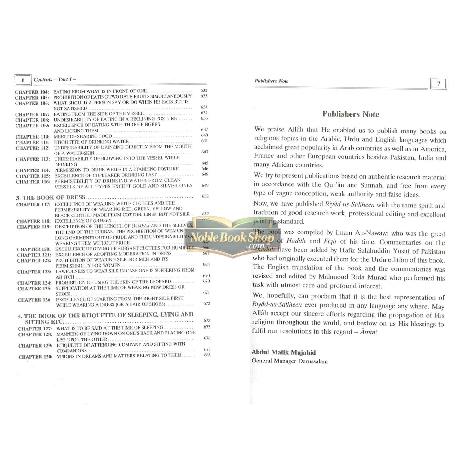 We praise ALLAH that He enabled us to publish many books on religious topics in the Arabic, Urdu and English languages which acclaimed great popularity in Arab countries as well as in America, France and European countries besides Pakistan, India and many African countries. We try to present publications based on authentic research material in lines with the Qur'an and Sunnah, and that are free from every type of vague conception, weak authority and false ideas. Now, we have published Riyad-us-Saliheen with the same spirit and same tradition of good research work, professional editing and excellent printing standard. The book was compiled by Imam An-Nawawi who was the great scholar of Hadith and Fiqh of his time. Commentaries on the Ahadith have been added by Hafiz Salahuddin Yusuf of Pakistan who had originally executed them for the Urdu edition of this book. The English translation of the book and the - commentaries was performed by Dr. Muhammad Amin and Abu Usamah Al-Arabi bin Razduq who have performed their task with utmost care and profound interest. We, hopefully, can proclaim that it is the best representation of Riyad-us-Saliheen ever produced in any language any where. May Allah accept our sincere efforts regarding the propagation of His religion throughout the world, and bestow on us His blessings to fulfil our resolutions in this regard -Amin!