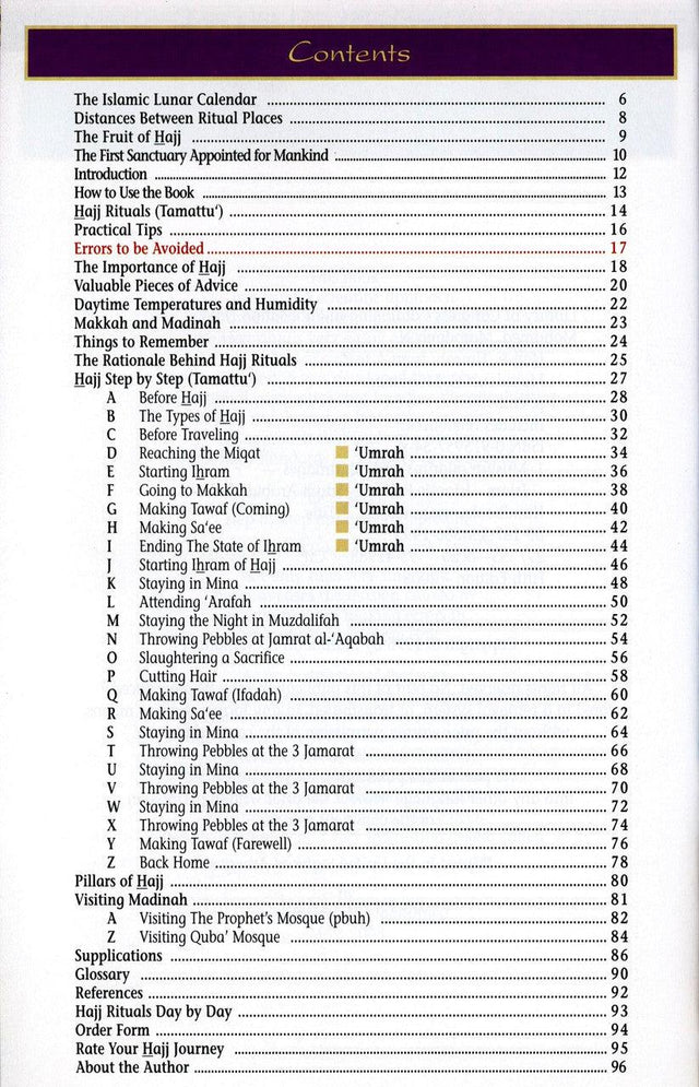 This is an illustrated guide-book, which includes charts, diagrams and photographs. Besides laying out the details of Hajj in a simple format this books other purpose is to alleviate the tension, anxiety and fear that some pilgrims may experience due to preconceived ideas about the difficulties of performing Hajj/pilgrimage. The book is formatted as follows: - A. before Hajj Time - B. Types of Hajj - C. Before Travelling - D. Reach Miqat - E. Start Ihram - F. Go to Makah - G. Make Tawaf - H. Make Sa'ee - I. End Ihram - J. Start Ihram - K. Stay in Mina - L. Attend Arafat - M. Stay in Muzdallifah - N. Jamrat al Aqabah - O. Slaughter a Sacrifice - P. Cut Your Hair - Q. Make Tawaf - R. Make Sa'ee - S. Stay in Mina - T. Throw Pebbles - U. Stay in Mina - V. Throw Pebbles - W. Stay in Mina - X. Throw Pebbles - Y. Make Tawaf - Z. Back Home