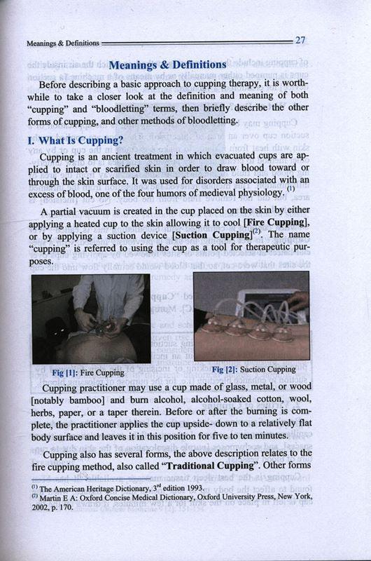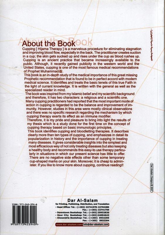 04CL1 Dr. Sahbaa M. BondokCupping (Hijama Therapy) is a marvelous procedure for eliminating stagnation and improving blood flow, especially in the back. The practitioner creates suction in a cup; the skin gets sucked up and rises under the cup as blood rushes up. Cupping is an ancient practice that has become increasingly available to the public. Although, it recently gained publicity in the western world and the United States, cupping is one of the most famous medical recommendations of Prophet Muhammad (Sallallaahu Álayhi Wasallam). This book is an in-depth study of the medical importance of this great missing Prophetic recommendation that is found to be in perfect accord with modern medical science. It identifies and treats the basic tenets of this true faith in the light of current knowledge. It is written with the general as well as the specialized reader in mind. The book was inspired from my Islamic and my scientific background and therefore, it has two characters: a religious and a scientific one. Many cupping practitioners had reported that the most important mode of action in cupping is regarded to be the balance and improvement of immunity. However, studies in this area were mostly clinical observations and there was no specific research regarding the mechanism by which cupping therapy exerts its effect as an immune modifier. Therefore, it is my pride and pleasure to bring into light the results of my thesis which is a study done for the first time on the concept of cupping therapy based on basic immunologic principles. The book identifies cupping and bloodletting therapies. It describes clearly more than ten types of cupping, and emphasizes in detail its popularization in history and the importance of cupping in treating many diseases. It gives considerable insight into the simplest and most effacious way of not only treating diseases but also keeping a healthy body and recommends this easy-to-use therapy particularly in situations in which our present science has little to offer. There are no negative side effects other than some temporary cup-shaped marks on your skin. Moreover, it is cheap to administer. If you would like to know more about cupping, continue reading
