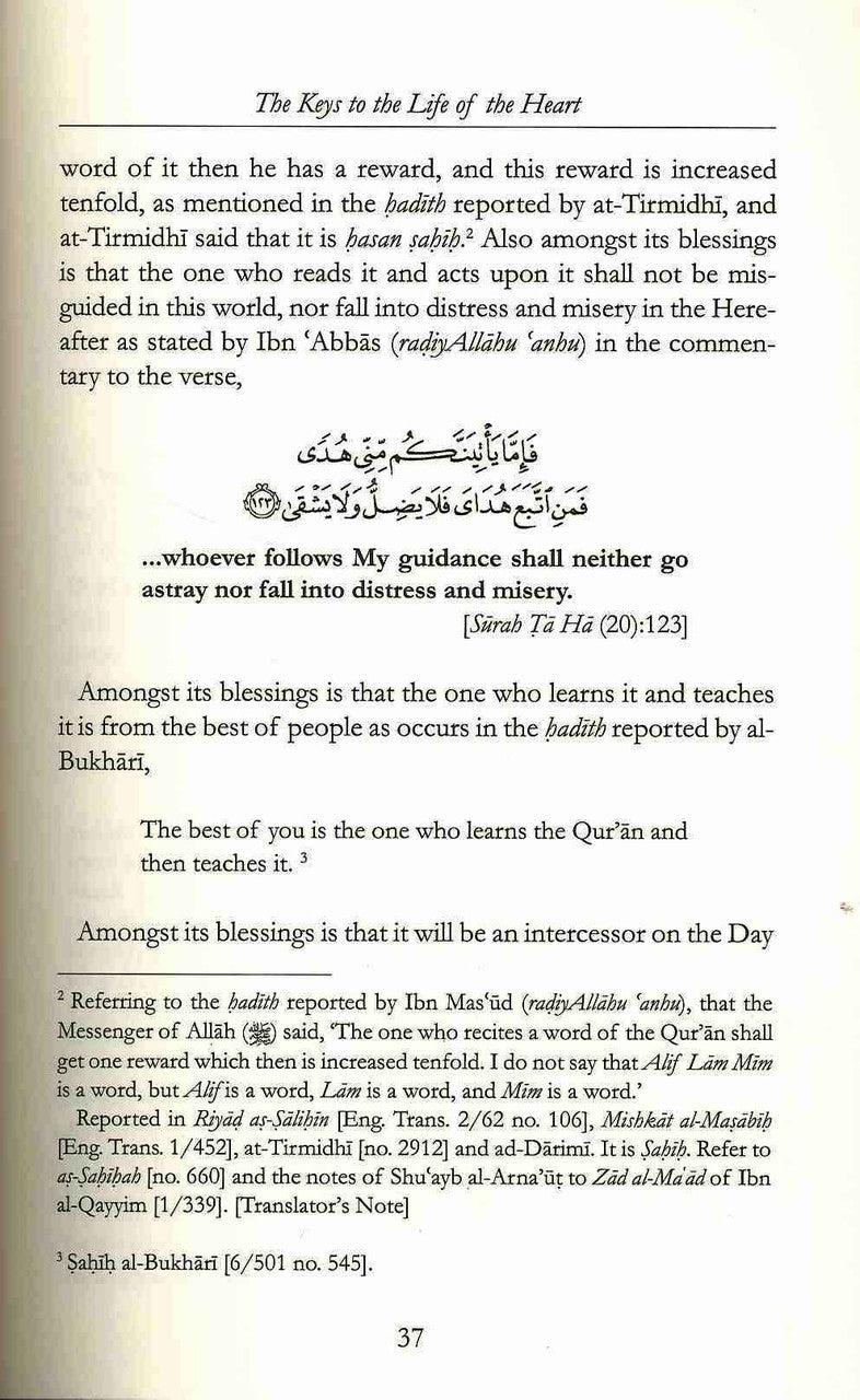 "Know O beloved reader that it is most important to spend one's time and energy in treating the heart, and hastening to correct and purify it from sickness and all sins. This is due to the heart occupying a great and lofty position in Islaam, for it is the place to which the Lord looks and the storehouse for tawheed, faith, and sincerity. Actions are distinguished, one from the other, with respect to their excellence in the Sight of Allah in accordance with the condition of the heart, not by their number or form, but rather due to the strength of the caller, his or her truthfulness, his or her sincerity and the extent to which he or she prefers Allah over himself or herself. Al-Haafidh ibn Hajr al-Asqalaanee, said: "The heart has been singled out for this because it is the leader of the body, and through the purification of the leader the subjects become purified, and with his corruption they become corrupted. So if you, O servant of Allah, with to cure your heart then it is upon you to be truthful with regards to seeking refuge with Allah and putting your trust in Him, to pray a great deal of superogatory prayers, to perform the actions of obedience to Allah frequently, to pray the night prayer while the people are sleeping, and to treat your heart by making it continuously stick to the remembrances and by befriending only the righteous ... and to frequently recite the Qur'an. And Allah will indeed allow all of this to be preserved by him."