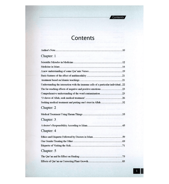 On the basis of Islamic teachings in light of the Qur'an and sunnah , this book devises the following (6) six basic categories for Islamic medicine : 1: Adhering to Islamic teachings and etiquette. 2: Adhering to logic in practising medicine. 3: Holistic approach, paying equal attention to the body, mind and soul, or individuals as well as societies. 4: Universal approach taking into account all resources and aiming to benefit all people. 5: Scientific approach, based on logical conclusions drawn from sound observations accurate statistics and trustworthy experience. 6: Excellence, achieving what other kinds of treatment has failed to achieve.