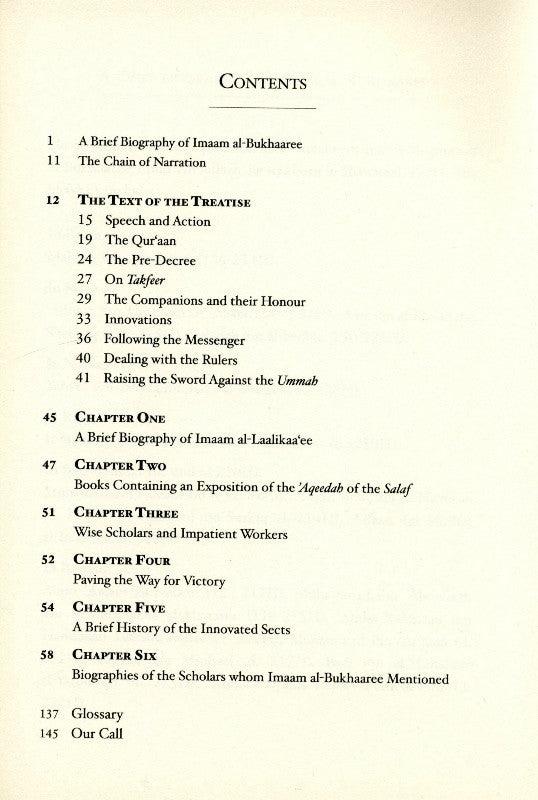 Imaam Al Bukharee states that he spent over forty six years travelling around the various Islamic lands, benefiting from the scholars of his time. He met over a thousand scholars, and took knowledge from and imparted knowledge to them. This book is a translation of a treatise narrated from Imam Bukharee contained in the encyclopedia of the Aqeedah known as, Sharh Usool Itiqaad Ahlus Sunnah Wal Jamaa'ah. (Explanation Of The Fundamentals Of The Creed Of Ahlus-Sunnah Wal-Jamaa'ah) of Imaam Al-Laalikaa'ee (Died 418 AH). So this book, O Muslim, is a translation of some of the points of the Creed of Ahlus Sunnah Wal Jamaah. The text is as relevant today as it was over one thousand years ago, if not more so, since confusion regarding matters of Manhaj and Aqeedah (Methodology and Creed) has increased. As Imam Maalik Bin Anas (Died 179 AH) said, The latter part of this Ummah will not be rectified except by that which rectified its earliest part.
