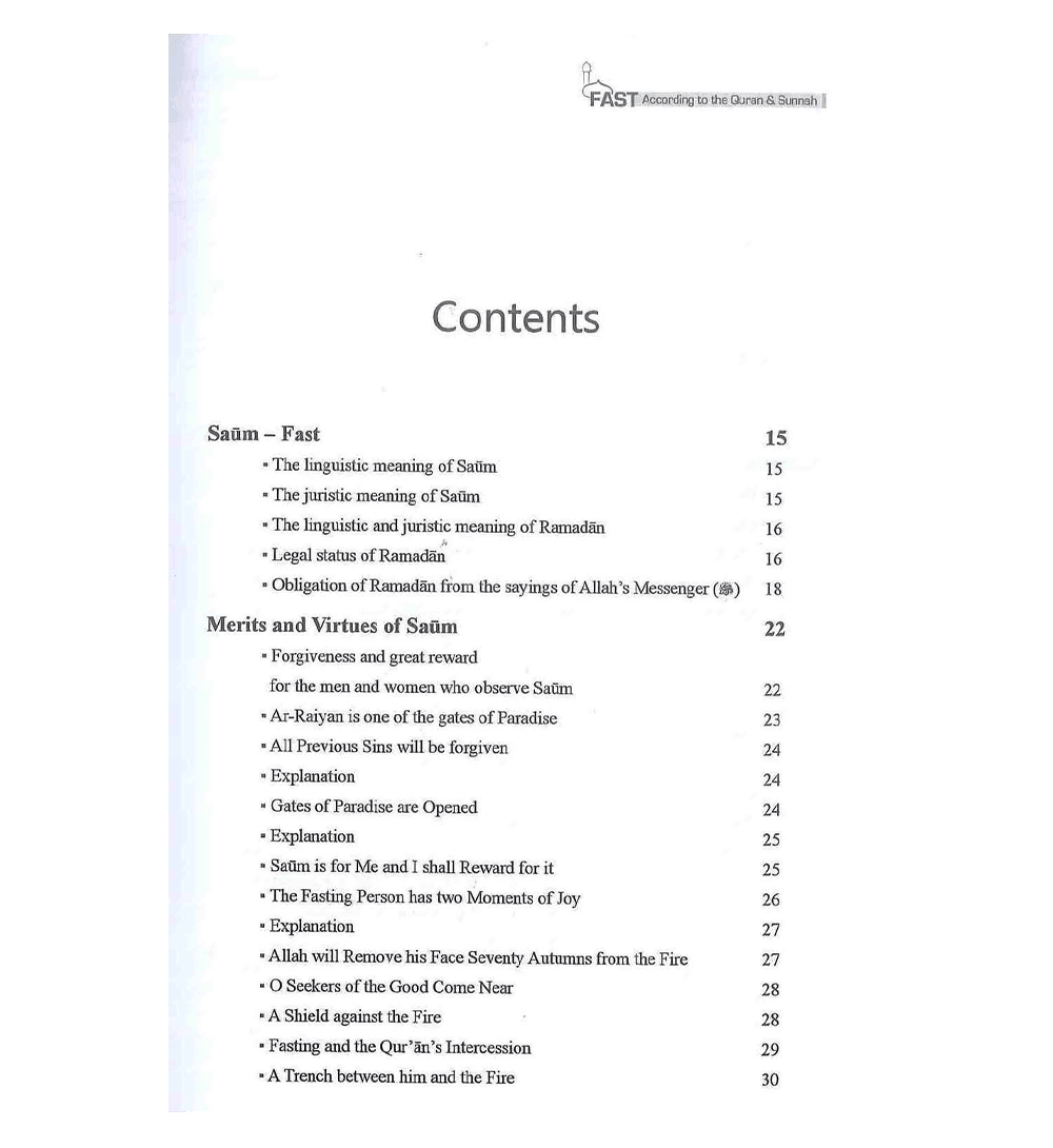 25A The Prophet صلی الله علیه وآلهِ وسلم said, "(ALLAH said), 'every good deed of the son of Adam is for him except fasting; it is for Me. and I shall reward (the fasting person) for it.' Verily, the smell of the mouth of a fasting person is better to Allah than the smell of musk." [Bukhari] As the status of this act of worship is so high, that it is essential to learn the rulings pertaining to this month of fasting, so that the Muslims may know what is obligatory in order to do it. What is forbidden and thus avoid it, and what is permissible so that they do not unnecessarily subject themselves to any hardship by depriving themselves from it. This book consists of all the main issues of Fasting. The main objective of this work is to serve as an easy guide and authentic reference to the reader.