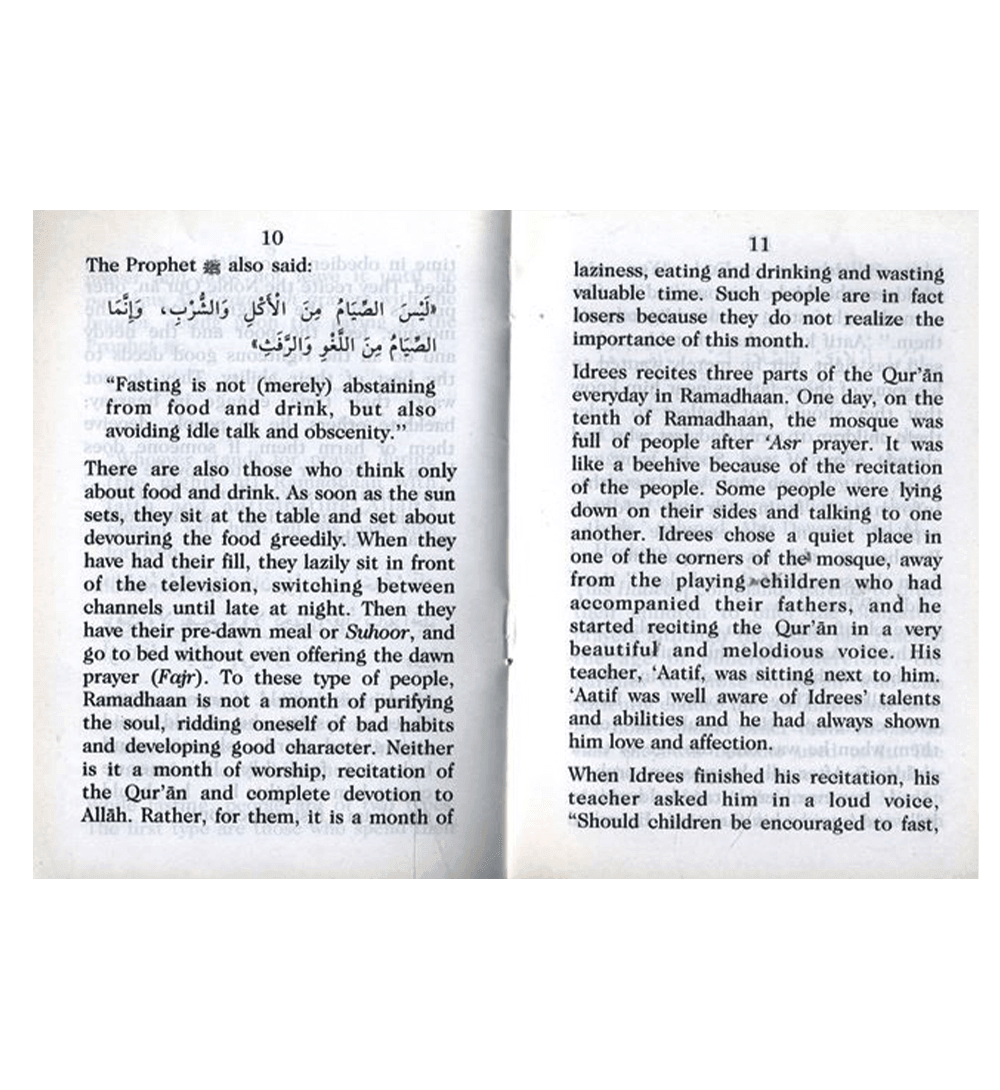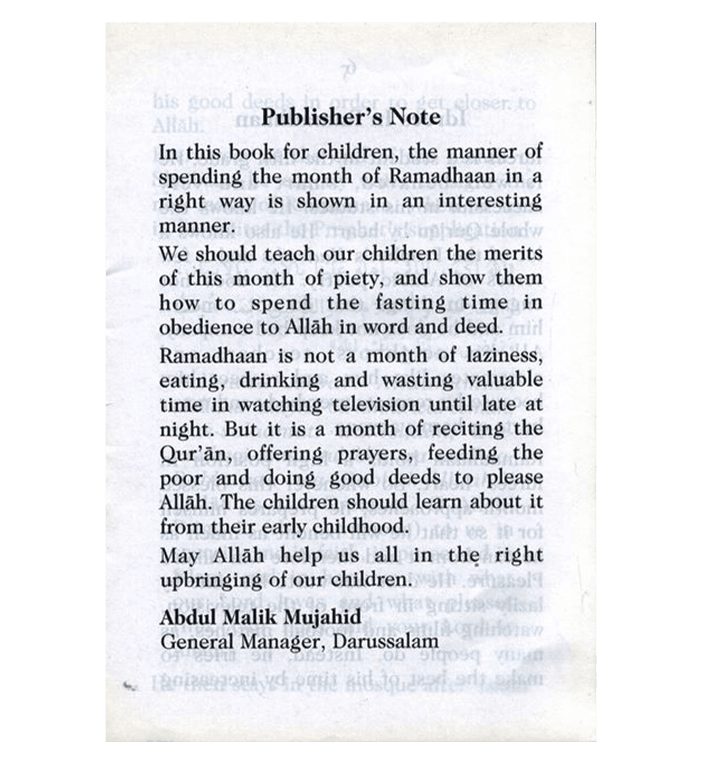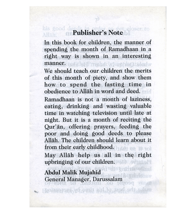 In this book for children, the manner of spending the month of Ramadhaan in a right way is shown in an interesting manner. We should teach our children the merits of this month of piety, and show them how to spend the fasting time in obedience to Allah in word and deed. Ramadhaan is not a month of laziness, eating, drinking and wasting valuable time in watching television until late at night. But it is a month of reciting the Qur'an, offering prayers, feeding the poor and doing good deeds to please Allah. The children should learn about it from their early childhood. May Allah help us all in the right upbringing of our children.