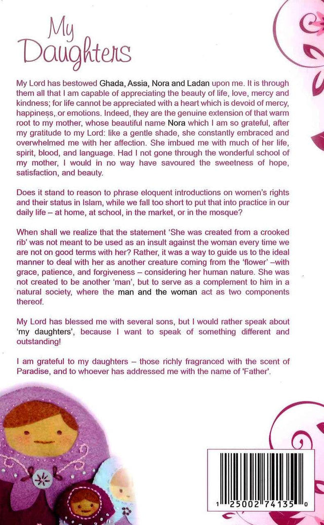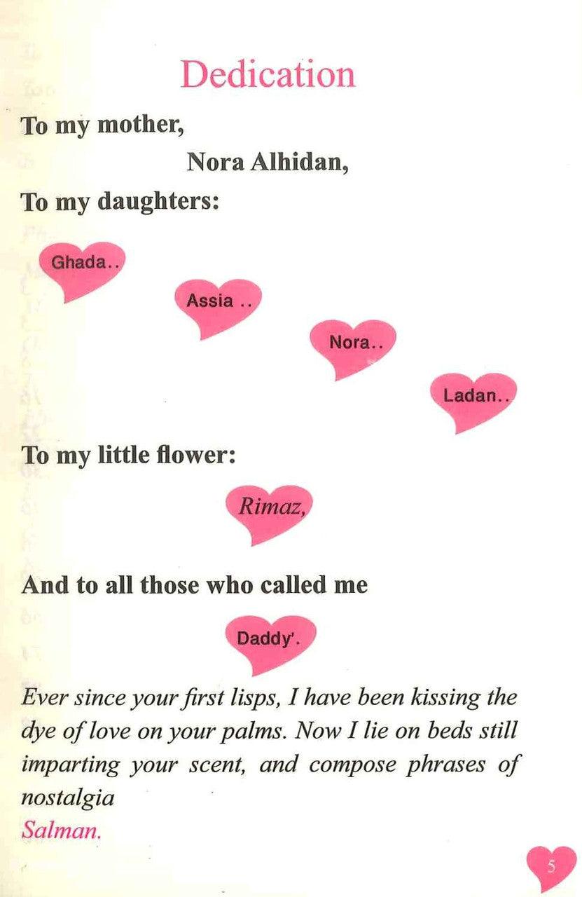 My Lord has bestowed Ghada , Assia,Nora and Ladan upon me. it is through them all that i am capable of appreciated with a heart which is devoid of mercy,happiness,or emotions,indeed,they are the genuine extension of that warmroot to my mother , whose beautiful name Nora which i am so grateful , after my gratitude to my lord : Like a gentle shade,she constantly embraced and overehelmed me with her affection.she imbued me with much of her life,spirit,blood and language.had i not gone through the wonderful school of my mother,i would in no way have nsavoured the sweetness of hope,satisfaction,and beauty.