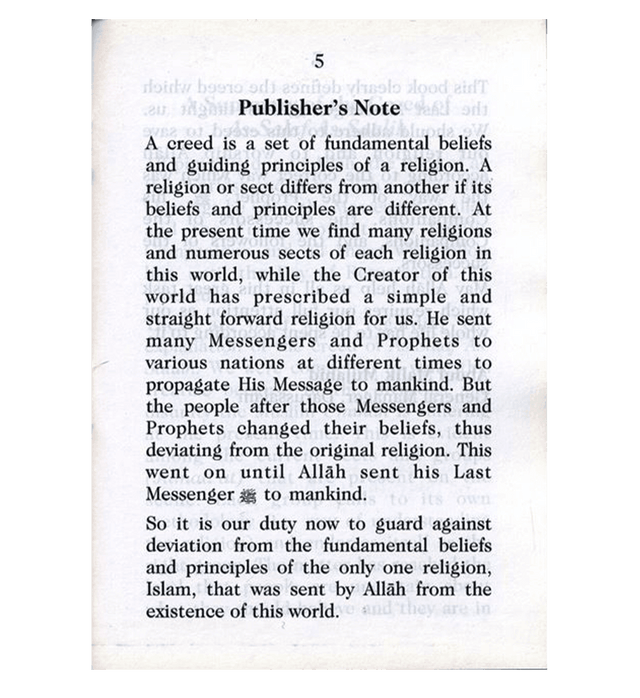 04CL1 A creed is a set of fundamental beliefs and guiding principles of a religion. A religion or sect differs from another if its beliefs and principles are different. At the present time we find many religions and numerous sects of each religion in this world, while the Creator of this world has prescribed a simple and straight forward religion for us. He sent many Messengers and Prophets to various nations at different times to propagate His Message to mankind. But the people after those Messengers and Prophets changed their beliefs, thus deviating from the original religion. This went on until Allah sent his Last Messenger (S) to mankind.So it is our duty now to guard against deviation from the fundamental beliefs and principles of the only one religion, Islam, that was sent by Allah from the existence of this world.This book clearly defines the creed which the Last Messenger (S) has taught us. We should adhere to this creed to save our religion and to worship Allah according to the correct way which was the way of the Prophet (S), his Companions, the successors of the Companions, and the followers of the successors.May Allah help us all in this great task which requires our full attention as our whole life has to be spent according to it