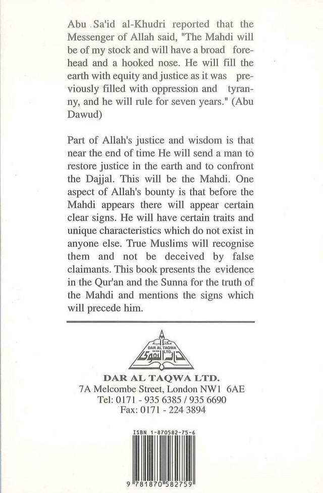 16B Part of ALLAH's justice and wisdom is that near the end of time He will send a man to restore justice in the earth and to confront the Dajjal. This will be the Mahdi. One aspect of Allah's bounty is that before the Mahdi appears there will appear certain clear signs. He will have certain traits and unique characteristics which do not exist in anyone else. True Muslims will recognise them and not be deceived by false claimants. This book presents the evidence in the Quran and the Sunnah for the truth of the Mahdi and mentions the signs which will precede him.