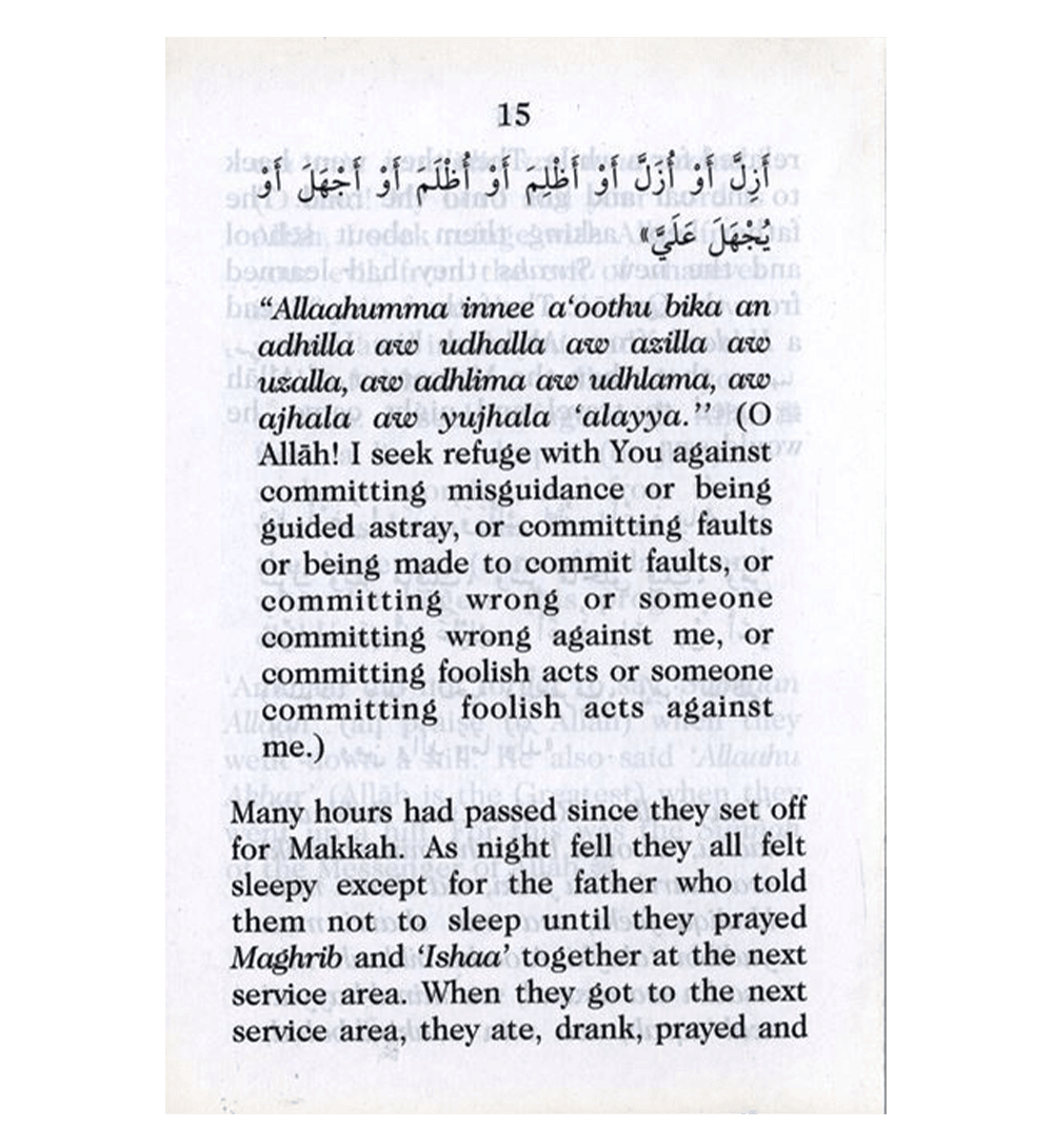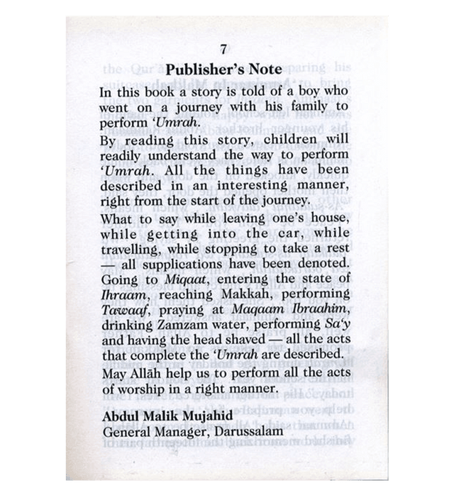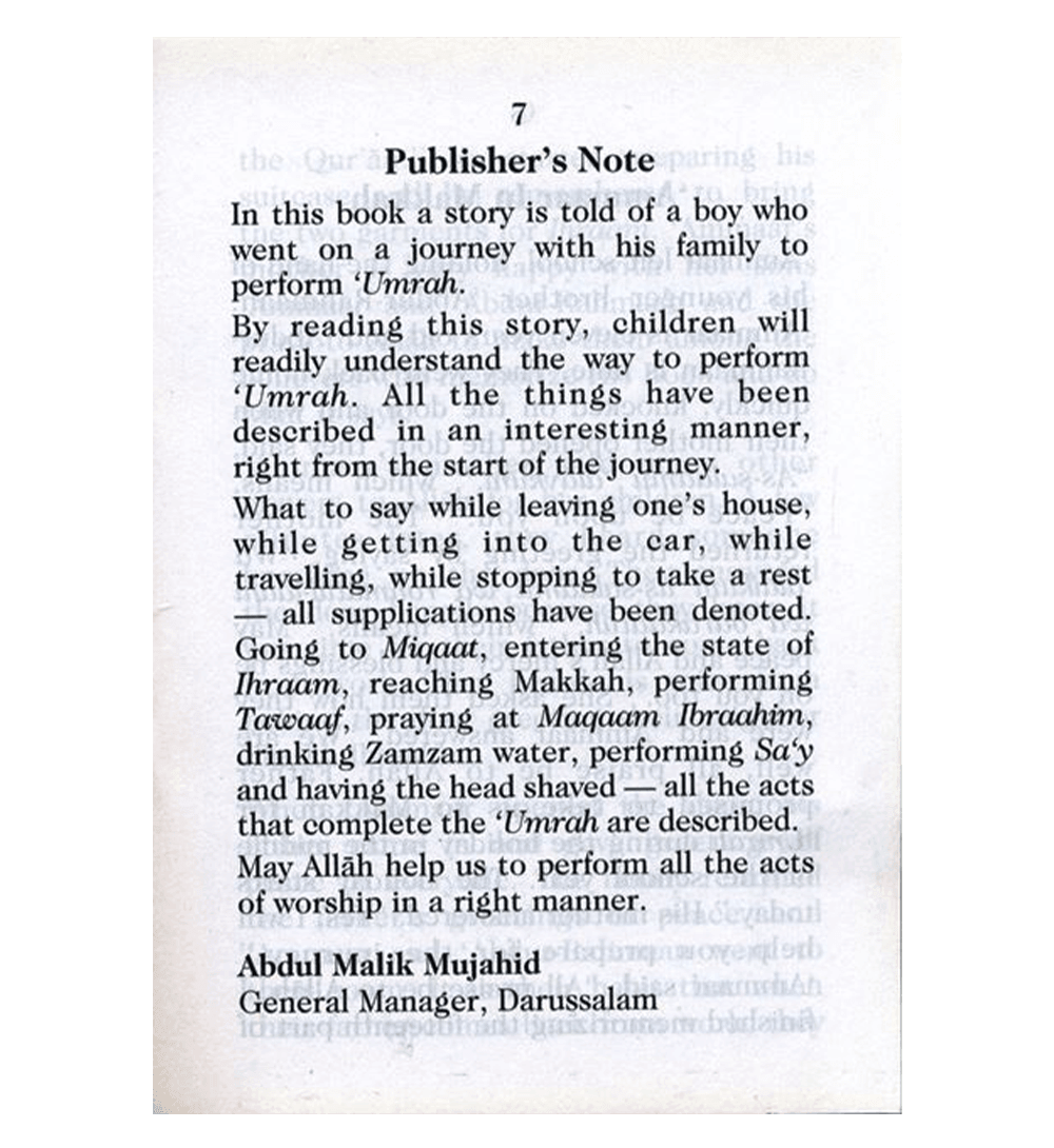 26C In this book a story is told of a boy who went on a journey with his family to perform 'Umrah.By reading this story, children will readily understand the way to perform 'Umrah. All the things have been described in an interesting manner, right from the start of the journey.What to say while leaving one's house, while getting into the car, while travelling, while stopping to take a rest - all supplications have been denoted. Going to Miqaat, entering the state of Ihraam, reaching Makkah, performing Tawaaf, praying at Maqaam Ibraahim, drinking Zamzam water, performing Say and having the head shaved - all the acts that complete the 'Umrah are described.May Allah help us to perform all the acts of worship in a right manner