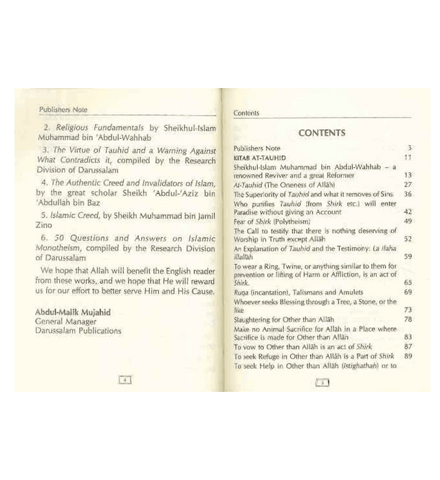 SL: 09 This book can be used as an easy reference on the topic of Tauhid in which important works on Tauhid are contained. Also, questions and answers and emphasis on explaining the truth about certain common misunderstandings have been included in this book. Following titles have been included in this collection: - Kitab At-Tauhid by Shaikhul-Islam Muhammad bin 'Abdul-Wahhab - Religious Fundamentals by Shaikhul-Islam Muhammad bin 'Abdul-Wahhab - The Virtue of Tauhid and a Warning Against What Contradicts it, compiled by the Research Division of Darussalam - The Authentic Creed and Invalidators of Islam, by the great scholar Shaikh 'Abdul-'Aziz bin 'Abdullah bin Baz - Islamic Creed, by Shaikh Muhammad bin Jamil Zino - 50 Questions and Answers on Islamic Monotheism compiled by the Research Division of Darussalam