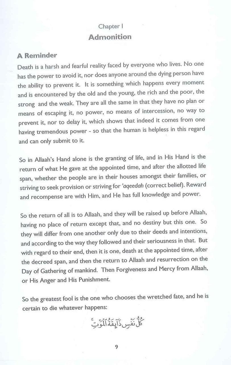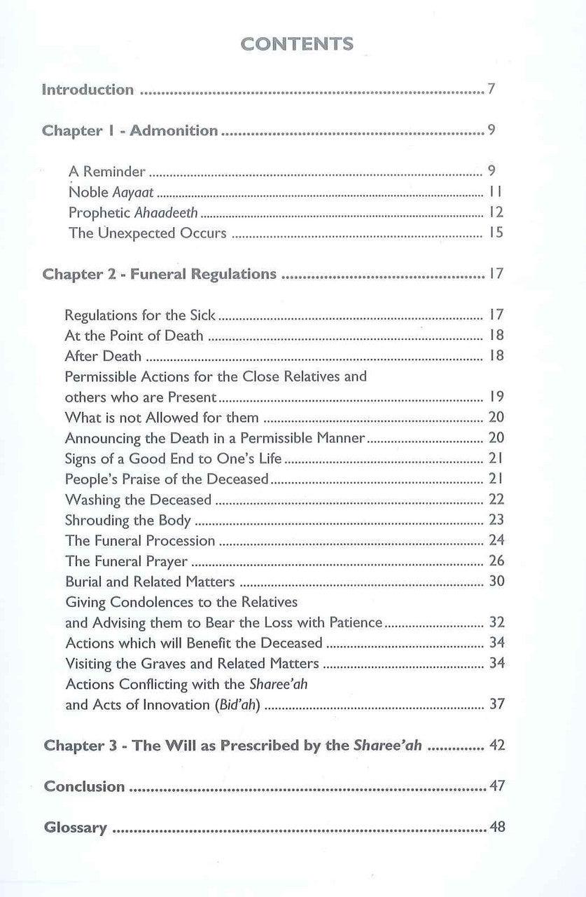 The righteous will die, And the wicked will die, The warriors who fight Jihad will die, And those who sit at home will die..., Those who busy themselves with correct belief will die, And those who treat the people as their slaves will die... The brave who reject injustice will die, And the cowards who seek to cling on to this life at any price will die... The people of great concern and lofty goals will die, And the wretched people who live only for cheap enjoyment will die... Everyone shall taste death... Includes sections on: Washing the deceased, burial, shrouding the deceased, funeral prayer, the will, prohibitions.