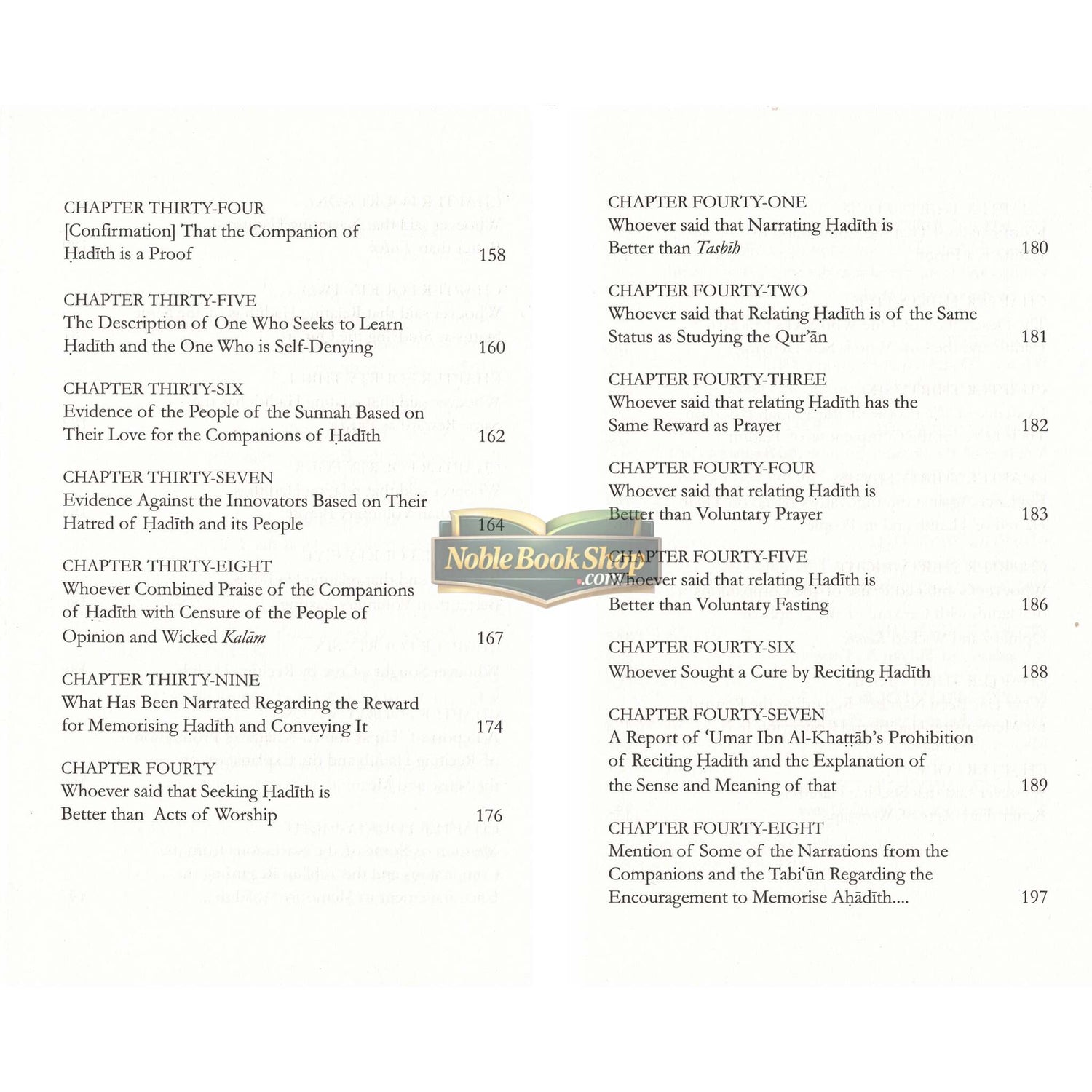 Abi Hatim al-Razi said: "No nation has existed since the creation of Adam, wherein its trustworthy ones memorise the narrations of the Messengers like this nation." Knowledge of Hadith is carried by the most worthy of people of every successive generation. They reprimand the radical elements for their attempted corruptions, the falsifiers for their distortions and the ignorant for their esoteric interpretations. They purify the Sunnah and refocus people's priorities back to the Prophetic narrations.Countless books have been authored on the subject of Hadīth sciences, the special status its scholars occupy and the nobility of those who adhere to the Sunnah and the scholarly reports regarding it. This book is among the finest in this field in the way it's arranged and the ease with which one can grasp the content. Al-Khatīb recounts Prophetic narrations, statements of the Muhaddithīn and scholars of renown, by way of his own chain of transmissions (isnād); and this is an especially unique feature of this book.