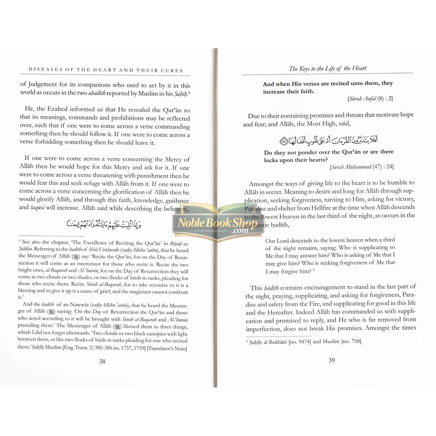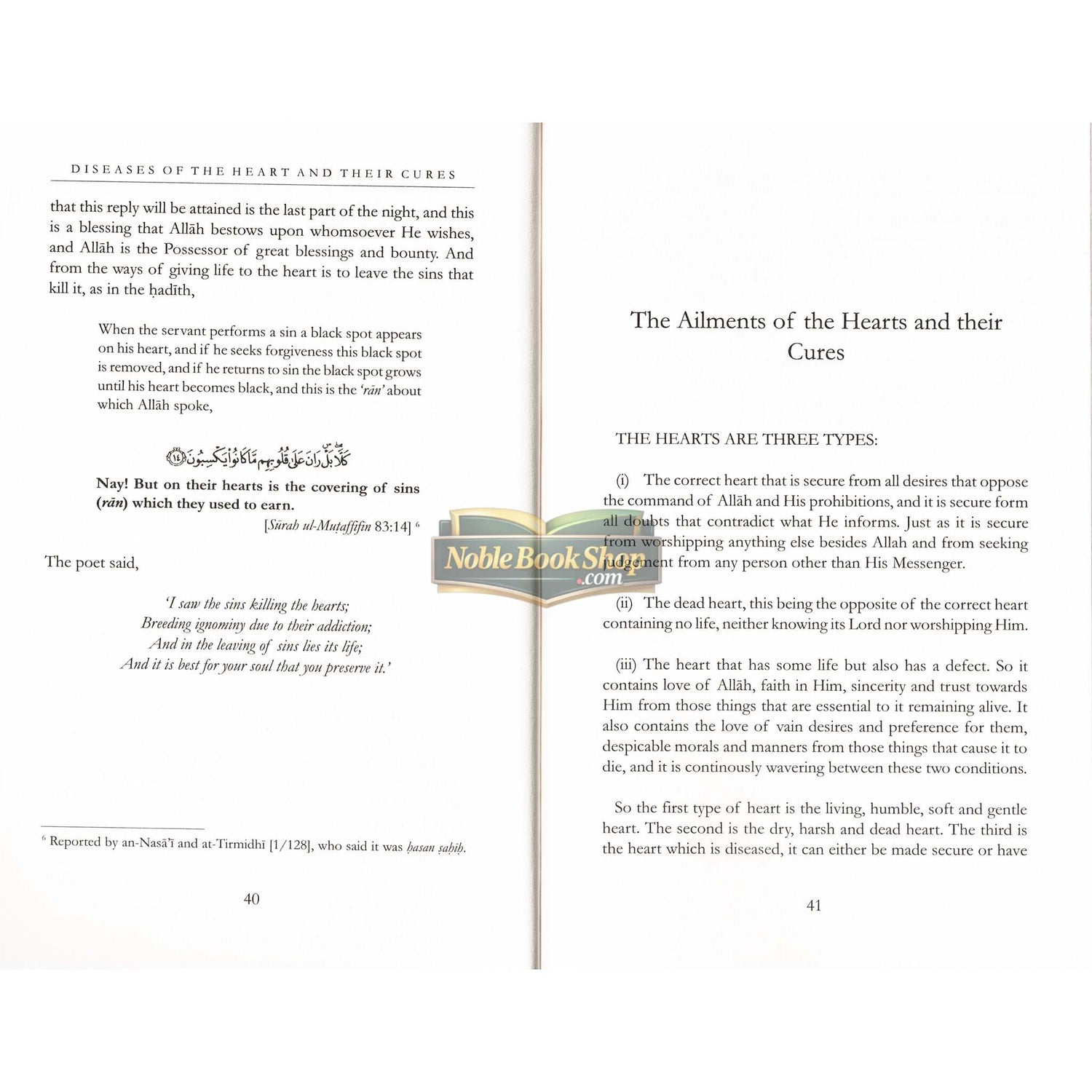 "Know O beloved reader that it is most important to spend one's time and energy in treating the heart, and hastening to correct and purify it from sickness and all sins. This is due to the heart occupying a great and lofty position in Islaam, for it is the place to which the Lord looks and the storehouse for tawheed, faith, and sincerity. Actions are distinguished, one from the other, with respect to their excellence in the Sight of Allah in accordance with the condition of the heart, not by their number or form, but rather due to the strength of the caller, his or her truthfulness, his or her sincerity and the extent to which he or she prefers Allah over himself or herself. Al-Haafidh ibn Hajr al-Asqalaanee, said: "The heart has been singled out for this because it is the leader of the body, and through the purification of the leader the subjects become purified, and with his corruption they become corrupted. So if you, O servant of Allah, with to cure your heart then it is upon you to be truthful with regards to seeking refuge with Allah and putting your trust in Him, to pray a great deal of superogatory prayers, to perform the actions of obedience to Allah frequently, to pray the night prayer while the people are sleeping, and to treat your heart by making it continuously stick to the remembrances and by befriending only the righteous ... and to frequently recite the Qur'an. And Allah will indeed allow all of this to be preserved by him."