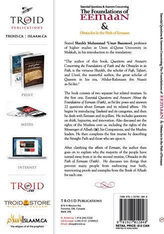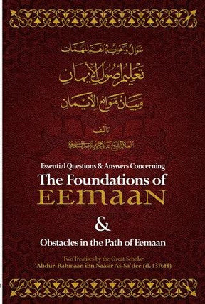 11B Essential Questions and Answers Concerning the Foundations of Eemaan (Faith) & Obstacles in the Path of Eemaan By: Imaam 'Abdur-Rahmaan as-Sa'dee "The author of this book, Questions and Answers Concerning the Foundations of Faith and the Obstacles in its Path, is the virtuous Shaykh, the scholar of Fiqh, Tafseer, and Usool, the masterful author, the great scholar of Qaseem in his era, 'Abdur-Rahmaan ibn Naasir as-Sa'dee." - Shaykh Muhammad 'Umar Baazmool, professor of higher studies at Umm al-Quraa University in Makkah, in his introduction to the translation. The book consists of two separate but related treatises. In the first one, Essential Questions and Answers About the Foundations of Eemaan (Faith), as-Sa'dee poses and answers 22 questions about Eemaan and its related affairs. He begins by introducing Tawheed and its categories, and then he deals with Eemaan and its pillars. He includes questions on shirk, hypocrisy, and innovation. [Also discussed are the rights of the Muslims over us, including the rights of the Messenger of Allaah (sallallaahu 'alayhi wa sallam), his Companions, and the Muslim leaders. He then completes the first treatise by describing the Straight Path and those who are upon it. After clarifying the affairs of Eemaan, the author then goes on to explain why the majority of the people have turned away from it in the second treatise, Obstacles in the Path of Eemaan (Faith). He discusses ten things that prevent many people from embracing true faith, mentioning proofs and examples from the Book of Allaah for each one.