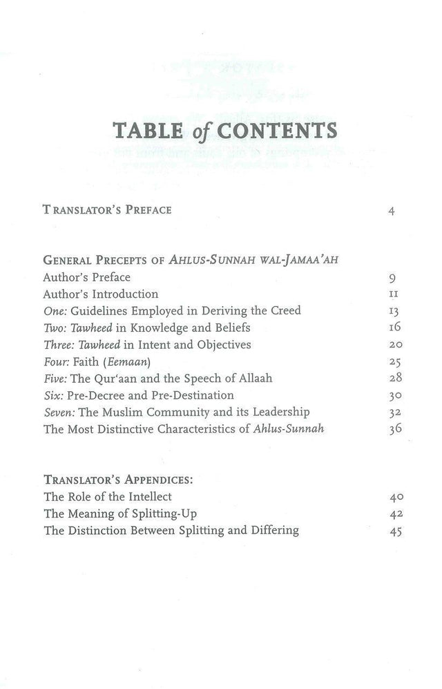 This is a small booklet concerning the fundamental precepts of Ahlus-Sunnah wal Jamaa'ah with regard to their beliefs and creed; each issue being presented to the reader in a clear, point by point form. The author prepared this booklet in response to the request of many students of knowledge, as well as the general Muslims, who expressed the need for a clear, yet concise presentation of the fundamentals of the creed of the Pious Predecessors. It is for this reason that this presentation is free from the details, definitions, evidences, names of personalities, quotations and footnotes that are quite often necessary for something of this nature.