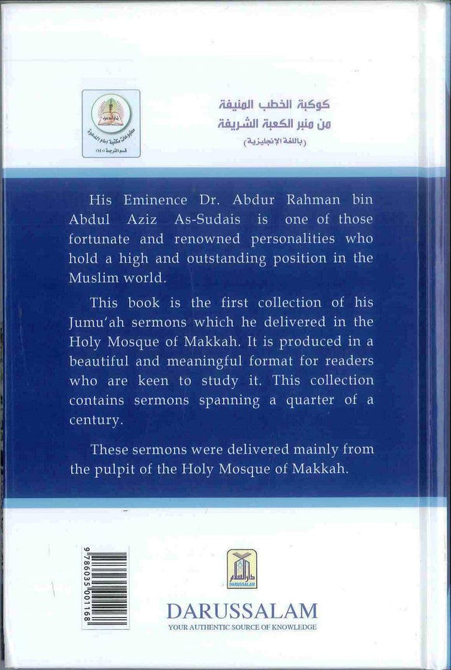 Glorious Sermons from The Haram Sheikh As-Sudais Glorious Sermons from The Haram Sheikh As-Sudais His Eminence Dr. Abdur Rahman bin Abdul Aziz As-Sudais is one of those fortunate and renowned personalities who holds a high and outstanding position in the Muslim world. This book is the first collection of his Jumu'ah sermons which he delivered in Haram Makkah after doing intensive preparation for each Khutba, thus making each Khutba unique and outstanding. It is produced in a beautiful and meaningful format for readers who are keen to study it. This collection contains sermons spanning a quarter of a century. These sermons were delivered mainly from the pulpit of the Holy Mosque of Makkah.