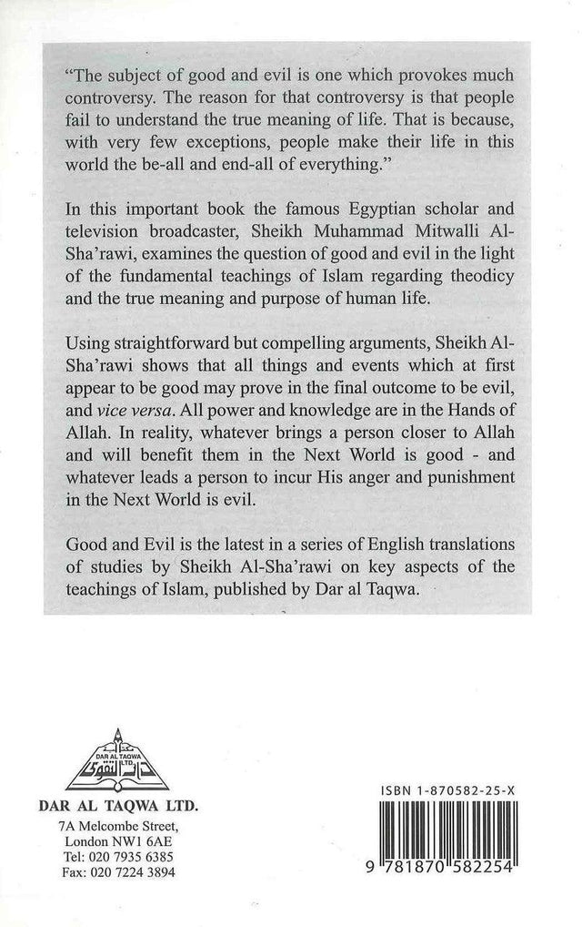 "The subject of good and evils is one which provokes much controversy. The reason for that controversy is that people fail to understand the true meaning of life. That is because, with very few exceptions, people make their life in this world the be-all and end-all of everything." In this important book the famous Egyptian scholar and television broadcaster, Sheikh Muhammad Mitwalli Al-Sha'rawi, examines the question of good and evil in the light of the fundamental teachings of Islam regarding theodicy and the true meaning and purpose of human life?