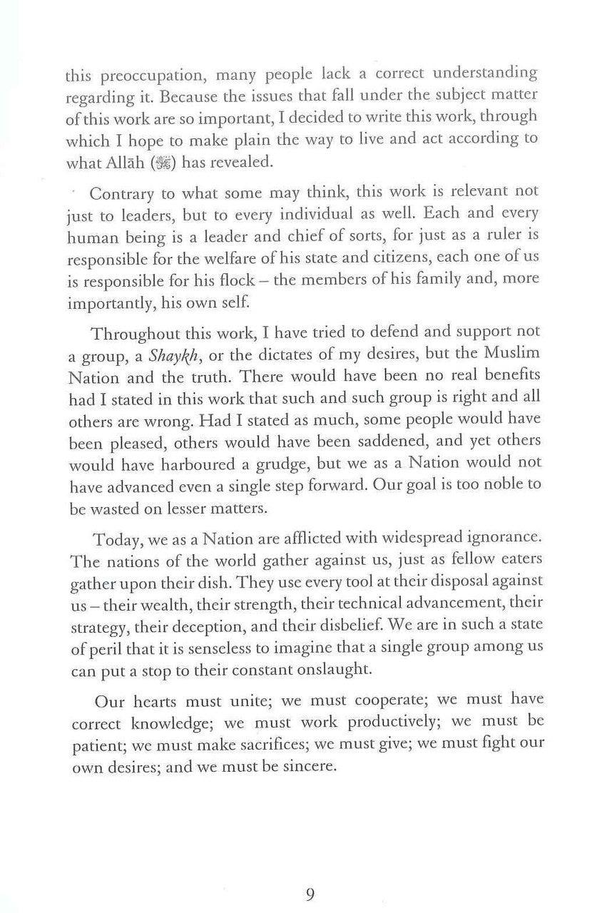 Governing yourself and your Family - According what Allah has revealed Taken from the author's introduction: The subject matter of this work has preoccupied and continues to preoccupy the minds of our nations memebers; yet in spite of this preoccupation, many people lack a correct understanding regarding it. Because the issues that fall under the subject matter of this work are so important, I decided to write this work, through which I hope to make plain the way to live and act according to what Allah has revealed. Contrary to what some may think, this work is relevant not just to leaders, but to every individual as well. Each and every human being is a leader and chief of sorts, for just as a ruler is responsible for the welfare of his state and citizens, each one of us is responsible for his flock - the members of his family, and more importantly his own self... Today we as a nation are afflicted with widespread ignorance. The nations of the world gather against us, just as fellow eaters gather upon their dish. They use every tool at their disposal against us - their wealth, their strength, their technical advancement, their strategy, their deception, and their disbelief. We are in such a state of peril that is is senseless to imagine that a single group among us can put a stop to their constant onslaught. Our hearts must unite; we must cooperate; we must have correct knowledge; we must work productively; we must be patient; we must make sacrifices; we must give; we must fight our own desires; and we must be sincere.