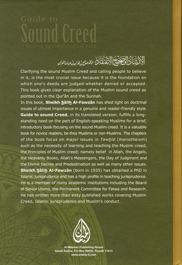 Clarifying the sound Muslim Creed and calling people to believe in it, is the most crucial issue because it is the foundation on which one's deeds are judged whether denied or accepted. This book gives clear explanation of the Muslim sound creed as pointed out in the Quran and Sunnah. In this book, Dr. Salih al Fawzan has shed light on doctrinal issues of utmost importance in a genuine and reader-friendly style. Guide to Sound Creed, in its translated version, fulfills a long introductory book focusing on the English-speaking Muslims for a brief, introductory book focusing on the sound Muslim creed. It is a valuable book for novice readers, be they Muslims or non-Muslims. The chapters of the book focus on major issues in Tawhid (monotheism) such as the necessity of learning and teaching the Muslim creed, the principles of Muslim creed; namely belief in Allah, the Angels, the Heavenly Books, Allah’s Messengers, the Day of Judgment, and the Divine Decree and Predestination as well as many other issues. Dr. Salih al Fawzan (born in 1935) has obtained a PhD in Islamic jurisprudence and has a high profile in teaching jurisprudence. He is a member of many academic institutions including the Board of Senior Ulema, the Permanent Committee for Fatwa and Research. He has written more than sixty published works covering Muslim Creed, Islamic jurisprudence and Muslim’s conduct.