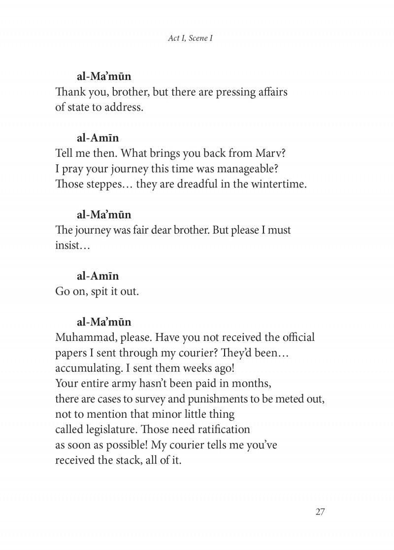 Set in the 9th Century Caliphal court in Baghdad, in the very halls once presided upon by the great Abbasid Caliph Harun al-Rashid, his son, al-Amin now reigns over the most powerful and most prosperous empire in the history of Islam. Under the rule of Harun al-Rashid, the Islamic Golden Age was at its zenith - a time of unprecedented scientific, religious and artistic prosperity. But the burden of maintaining his fathers vast empire weighs heavy upon the reckless al-Amin. His stately and learned half brother al-Ma'mun has suffered witnessing the degradation of the House of Abbas at the hands of careless new Caliph. What was once an intimate fraternal bond may soon untether, jeopardizing the legacy of harun al-Rashid and threatening to tear a once glorious empire apart from the inside out. Written in pentameter, House of Abbas is an ambitious verse play that conjures unapologetically the spectre of true Shakeperean tragedy.