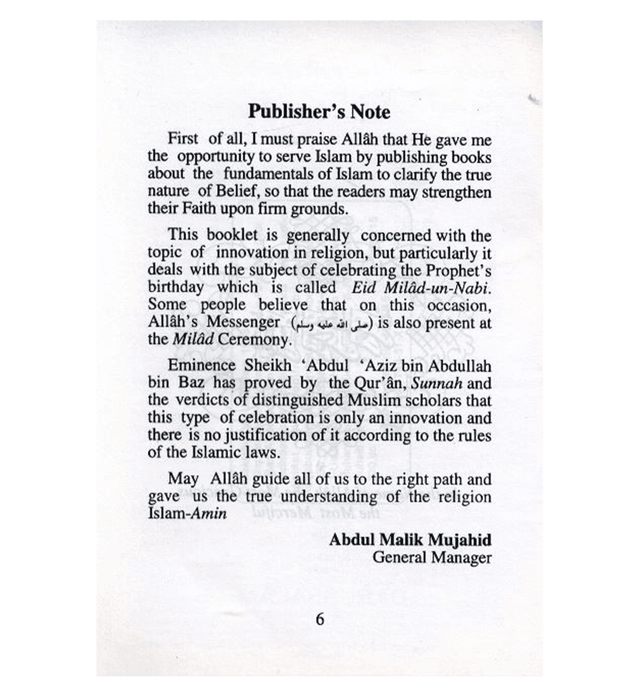 This booklet is generally concerned with the topic of innovation in religion, but particularly, it deals with the subject of celebrating the Prophet's صلى الله عليه وسلم birthday which is called Eid Milad-un-Nabi صلى الله عليه وسلم. Some people believe that on this occassion, Allah's Messenger صلى الله عليه وسلم is also present at the Milad Ceremony. His Eminence Shaykh Abdul Aiz bin Baz has proven by the Qur'an, the Sunnah and the verdicts of distinguished muslim scholars that this type of celebration is only an innovation and thrtr is no justification of it according to the rules of the Islamic laws.
