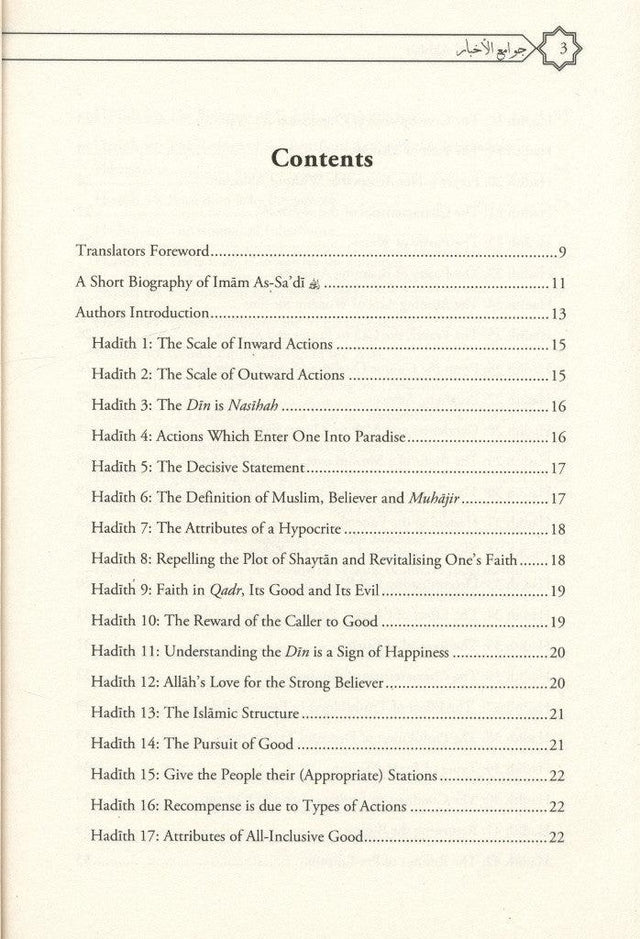 15B A Selection of Hadeeths which Contain the Comprehensive Speech of the Messenger of ALLAH ('Allamah 'Abdur-Rahman bin Nasir as-Sa'di) This book is a collection of 99 Hadeeths which contain the concise speech of the Prophet sallallahu alaihi wa salam, compiled by 'Allaamah 'Abdur-Rahman as-Sa'di. The ability to use little words and yet carry abundant meanings is from the special qualities of the the Prophet sallallahu alaihi wa salam, who said: "I have been given the Jawami'ul-Kalim (concise speech)..." [Reported by al-Bukharee]. This collection highlights a portion of them, which the Shaykh compiled in order to explain in his book 'Bahjatul-Quloobil Abraar..'. In this publication, we have presented the original text in Arabic with full tashkeel (diactrical marks) alongside its translation in the English language. We have paid particular attention to the presentation of the book and printed the book on cream color pages in order to aid group studies and memorization. About the author: He is the noble Shaykh al-'Allaamah 'Abdur-Rahmaan bin Naasir as-Sa'di, one of the major scholars of Saudi Arabia in our present times. He excelled in the various sciences of Islam and authored many beneficial works which have been highly praised by the Scholars after him.). About Shaykh Abu Abdu-r-Rahman Nasir As-Sa'di Abd ar-Rahman ibn Nasir as-Sa'di at-Tamimi (1889 – 1956 C.E.) was a prominent Islamic scholar, jurist, exegete, and Arabic grammarian with a great interest in poetry who contributed many works on a variety of subjects. Initially, he adhered to the Hanbali school of Islamic law (madhab), as did his early teachers. He went on to study the works of Ibn Taymiyyah (d.1328) and Ibn al-Qayyim (d.1350) extensively, and, as he progressed in his studies, he no longer restricted himself to the Hanbali School, but rather followed the course he believed to be proven by the strongest evidences. He was also an expert in tafsir (Quranic exegesis or commentary), having read many books of tafsir and studied it under his teachers; he later authored a tafsir himself. From his most famous students is 'Allaamah Muhammad bin Saalih al-Uthaymeen. The Shaykh died 1376 A.H. (1957 C.E.