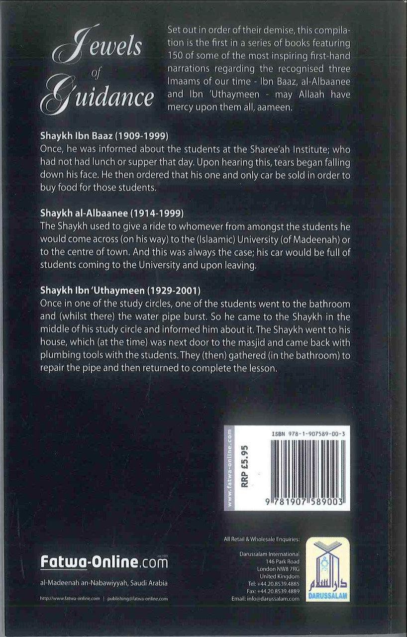 Jewels of Guidance : Volume One : Gems from the Lives of the 3 Imaams Glowing tributes and inspirational tales from the lives of these 3 modern imams who were pious and righteous. The three are: Shaykhs Abdullah bin Baaz (Ibn Baz), Shaykh Nasiruddin (Nasir al Din) al Albaani (al-Albani), Shaykh Ibn Uthaymeen, may ALLAH Bless them.