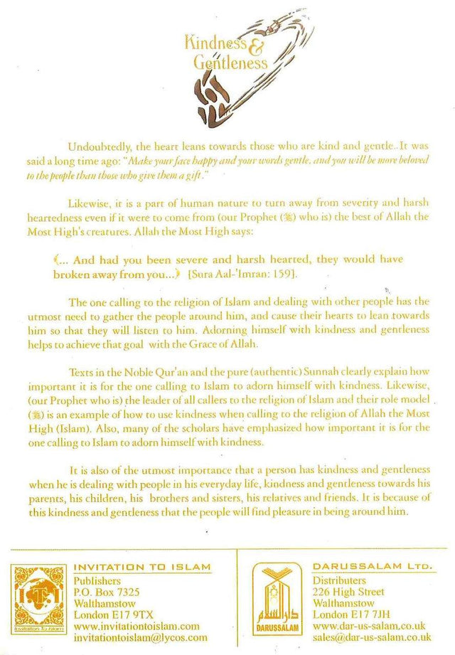 14B Undoubtedly, the heart leans towards those who are kind and gentle. It was said a long time ago: "Make your face happy and your words gentle, and you will be more beloved to the people than those who give them a gift". Likewise, it is a part of human nature to turn away from severity and harsh heartedness even if it were to come from (our Prophet who is) the best of Allaah the Most High's creatures. Allaah the Most High says: "...And had you been severe and harsh hearted, they would have broken away from you..." The one calling to the religion of Islam and dealing with other people has the utmost need to gather the people around him, and cause their hearts to lean towards him so that they will listen to him. Adorning himself with kindness and gentleness helps to achieve that goal with the grace of Allaah.