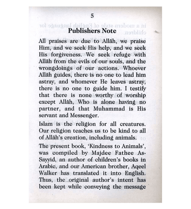 All praises are due to Allah, we praise Him, and we seek His help, and we seek His, forgiveness. We seek refuge with Allah from the evils of our souls, and the wrongdoings of our actions. Whoever Allah guides, there is no one to lead him astray, and whomever He leaves astray, there is no one to guide him. I testify that there is none worthy of worship except Allah, Who is alone having no partner, and that Muhammad is His servant and Messenger. Islam is the religion for all creatures. Our religion teaches us to be kind to all of Allah's creation, including animals. The present book, 'Kindness to Animals', was compiled by Majdee Fathee As-Sayyid; an author of children's books in Arabic, and our American brother, Aqeel Walker has translated it into English. Thus, the original author's intent has been kept while conveying the message in a modern style of English language for children. I hope that this publication will describe and give a simple account of how a Muslim child can increase kindness to animals. We also hope that the parents will appreciate our efforts in this regard and help their children to benefit from this book.
