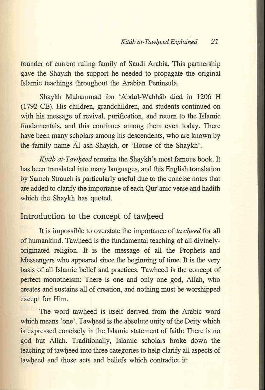 03C All praise be to ALLAH (swt ) `The Exalted, the Rabb of the worlds, and our Prophet, Muhammad (s.a.w.w) `Blessings and Peace be upon him', and upon all his family and companions. When I embraced Islam in 1983, by the grace of ALLAH (swt ), one of the first books which I was given to read was a translation of Kitaab At-Tawheed by the renowned scholar, Muhammad Ibn `Abdil Wahhaab: I understood very little of it and was driven to the conclusion that this was because I was new to Islam and therefore lacked knowledge. It was only later, when I was fortunate enough to study the book, Taiseer Al-'Azeez Al-Hameed in Arabic, that I realized that not even Arabic speakers try to understand KitaabAt-Tawheed without the benefit of an explanation. It has therefore been in my mind for some time to try to provide English-speakers with an explanation of this great work, but unfortunately, other projects diverted me until now. In compiling this explanation, I have relied mainly on Al-Jadeed Fee Sharh Kitaab At-Tawheed by Shaikh Muhammad Al-Qar'aawi, Tafseer Ibn Katheer and a number of books of Hadith. " Our Rabb! Punish us not if we forget or fall into error, our Rabb! Lay not on us a burden like that which You laid on those before us; our Rabb! Put not on us a burden greater than we have strength to bear. Pardon us and grant us forgiveness. Have mercy on us. You are our Protector; and give us victory over the disbelieving people" (Qur'an 2:286).
