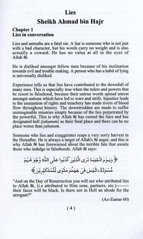 Sheikh Ahmed bin Hajr has undertaken the task to remind us of how great a sin lies are, by very lucidly presenting its negatives in the light of Allah's revelations in the Quran and Ahadeeth (sayings) of Prophet Muhammad giving very simple examples along the way.