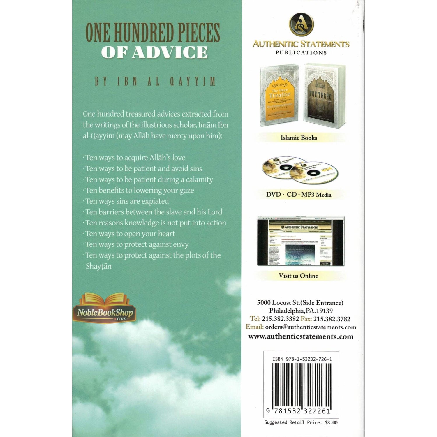 One hundred treasured advices extracted from the writings of the illustrious scholar, Imām Ibn al-Qayyim (may Allāh have mercy upon him): Ten ways to acquire Allāh’s love Ten ways to be patient and avoid sins Ten ways to be patient during a calamity Ten benefits to lowering your gaze Ten ways sins are expiated Ten barriers between the slave and his Lord Ten reasons knowledge is not put into action Ten ways to open your heart Ten ways to protect against envy Ten ways to protect against the plots of the Shayṭān
