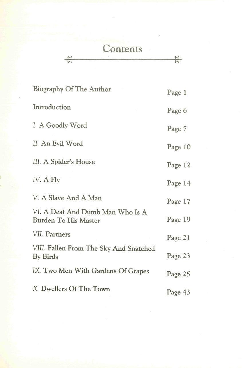 Before you O reader, are ten parables from the Qur'aan wherein our Lord and Creator, the One Alone deserving of our worship, has revealed parables by which we may be guided to His worship and servitude and warned against associating partners in worship alongside Him. He, the Most High, has stated: "See you not how Allaah sets forth a parable?.." The parables are explained by Imaam As-Sa'dee in a manner that causes one to reflect and one's Eemaan to be strengthened and increased. As Imaam As-Sa'dee, may Allaah's Mercy be upon him, states: "So giving parables which show concepts in the light of physical examples enables the meaning which Allaah intended to become fully clear and apparent." We pray that Allaah, the Most High, brings about benefit by way of this beautiful explanation of Imaam As-Sa'dee.