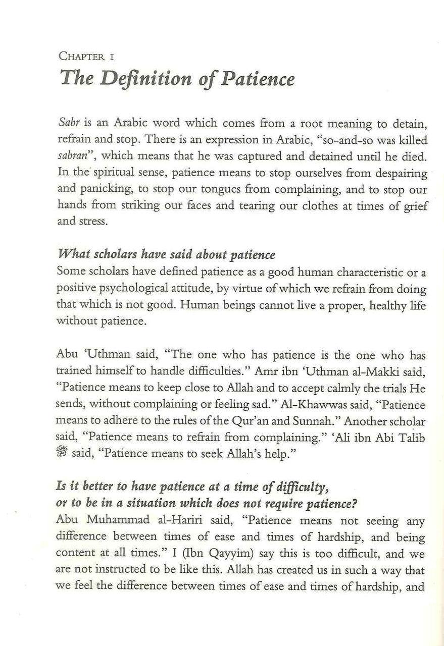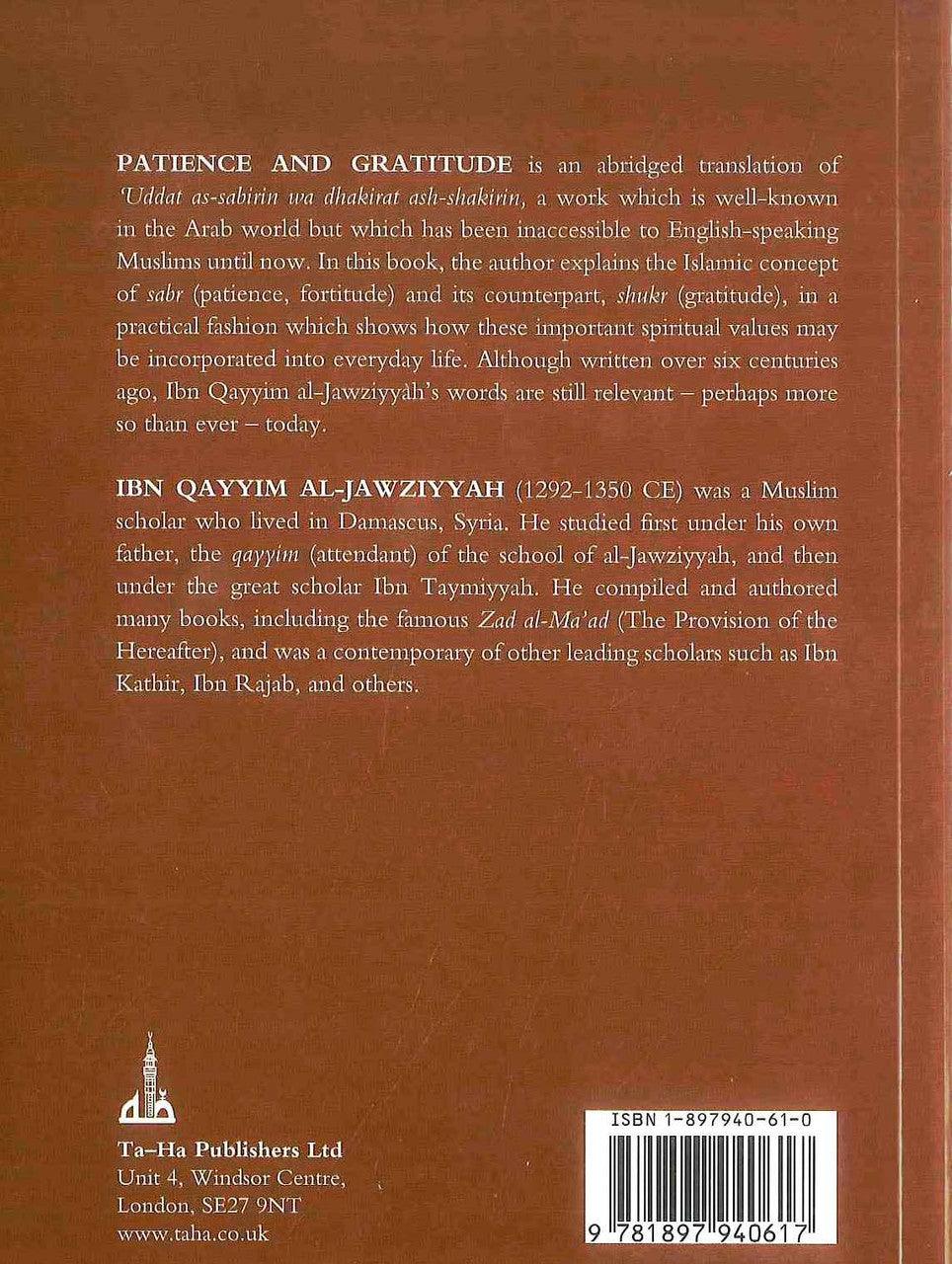 Patience and Gratitude is an abridged translation of in the Arab world but which has been inaccessible to English-speaking of sabr (patience, fortitude) and its counterpart, shukr(gratitude), in a practical fashion which shows how these important spiritual values may be incorporated into everyday life. Although written over six centuries ago, Ibn Qayyim al-Jawziyyah's words are still relevant-perhaps more so than ever-today. Ibn Qayyim al-Jawziyyah _1292-1350 CE) was a Muslim Scholar who lived in Damascus, Syria. He studied first under his own father, the qayyim (attendant of the school of al-jawziyyah, and then under the great scholar Ibn Taymiyyah. He compiled and authored many books, including the famous Zad al-Ma'ad(The Provision of the hereafter), and was contemporary of other leading scholars such as Ibn Kathir, Ibn Rajab, and others.