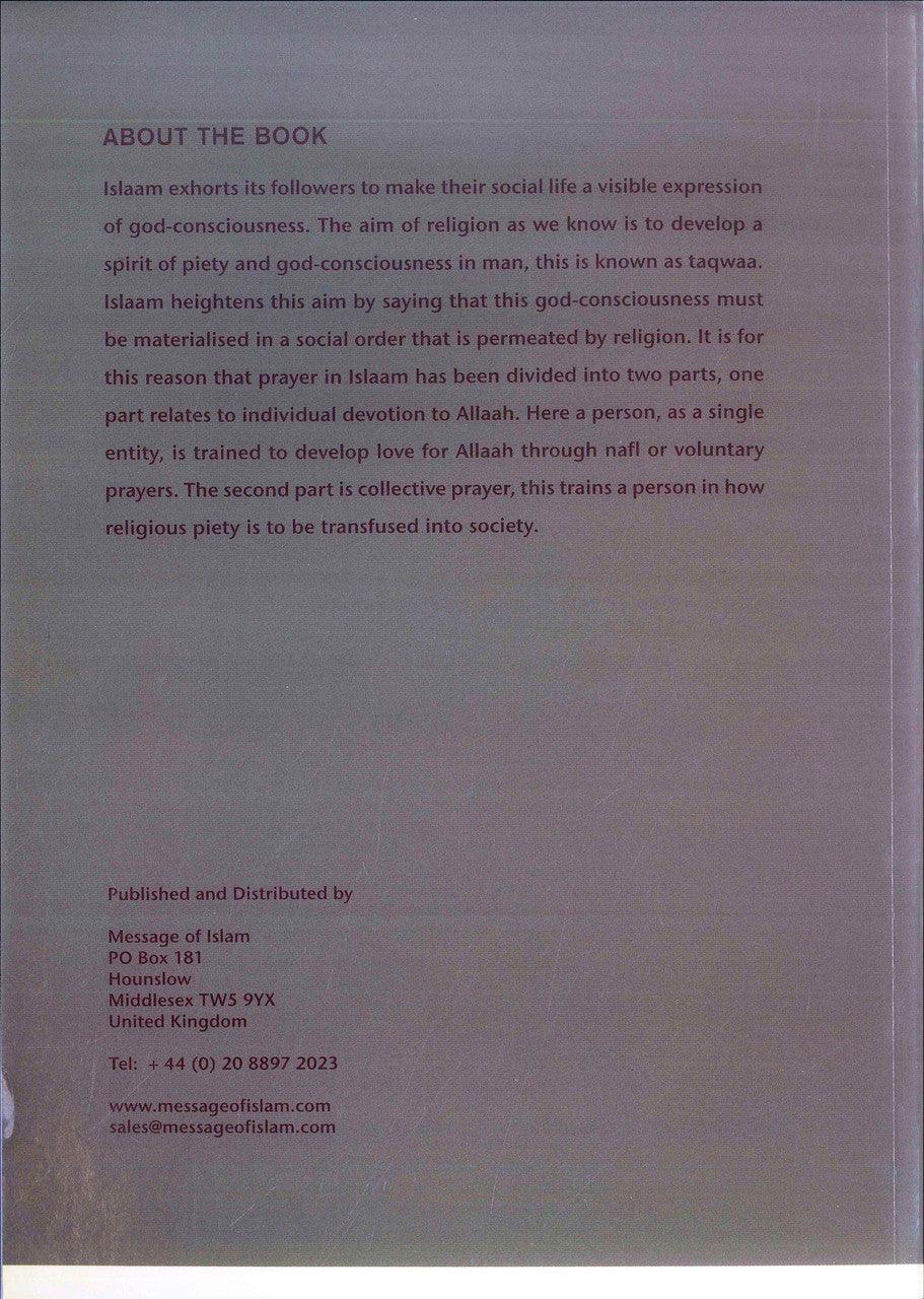 14A Islam exhorts its followers to make their social life a visible expression of god-consciousness. The aim of religion as we know is to develop a spirit of piety & god-consciousness in man, this is known as taqwa. Islam hightens this aim by saying that this god-consciousness must be materialised in a social order that is permitted by religion. It is for this that prayer in islam has been divided into two parts, one part is relates to individual devotion to ALLAH. Here a person, as a single entity, is trained to develop love for Allah through nafl or voluntary prayers. The second part is collective prayer, this trains a person in how religious piety is to be transfused into society.