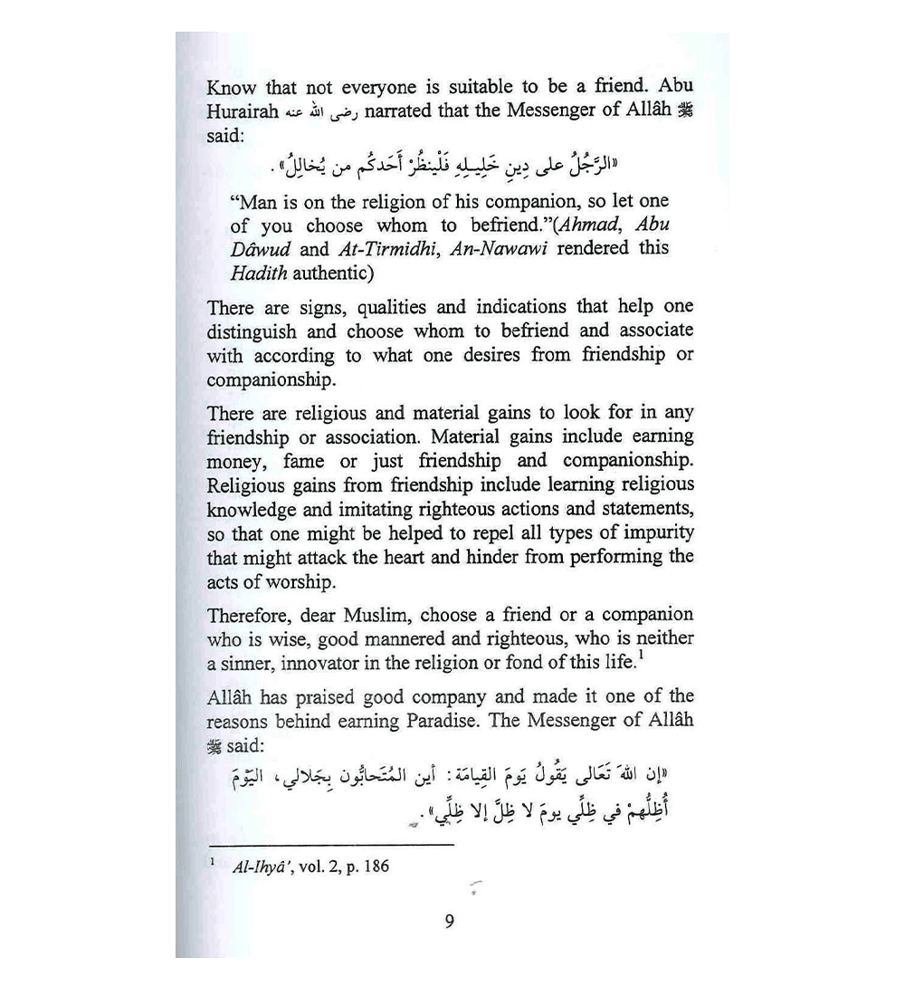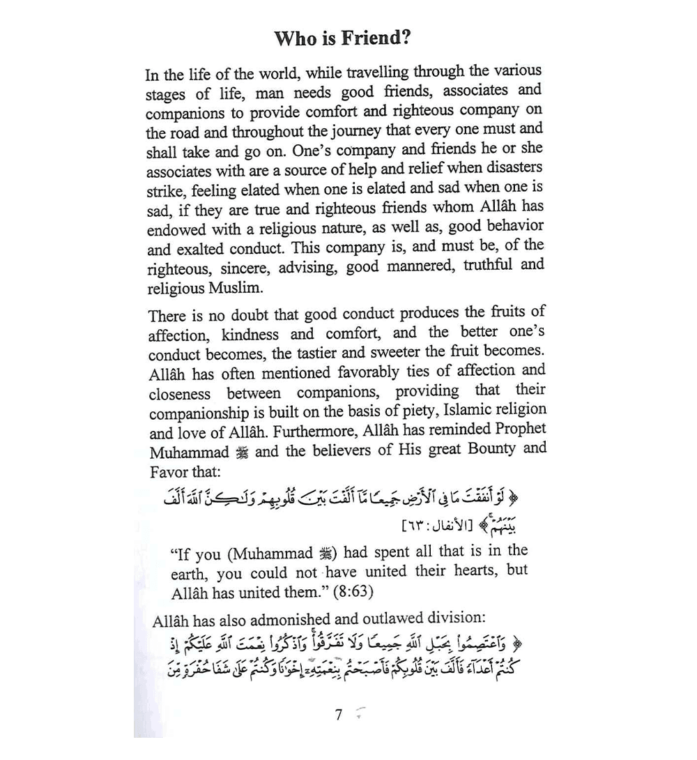 The Road to Good Friendship by Abdul Malik Al-Qasim The distinguished feature of this booklet is to enhance good friendship in society. The author has selected the illuminating sayings of the Prophet(pbhu) and those of his Companions and the Salaf. These advices will encourage good friendship in the Muslim society and will open the door wide to establish a civilized Islamic culture. This society based on true friendship will breed justice, equality and love for humanity.
