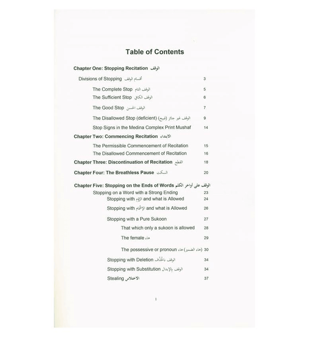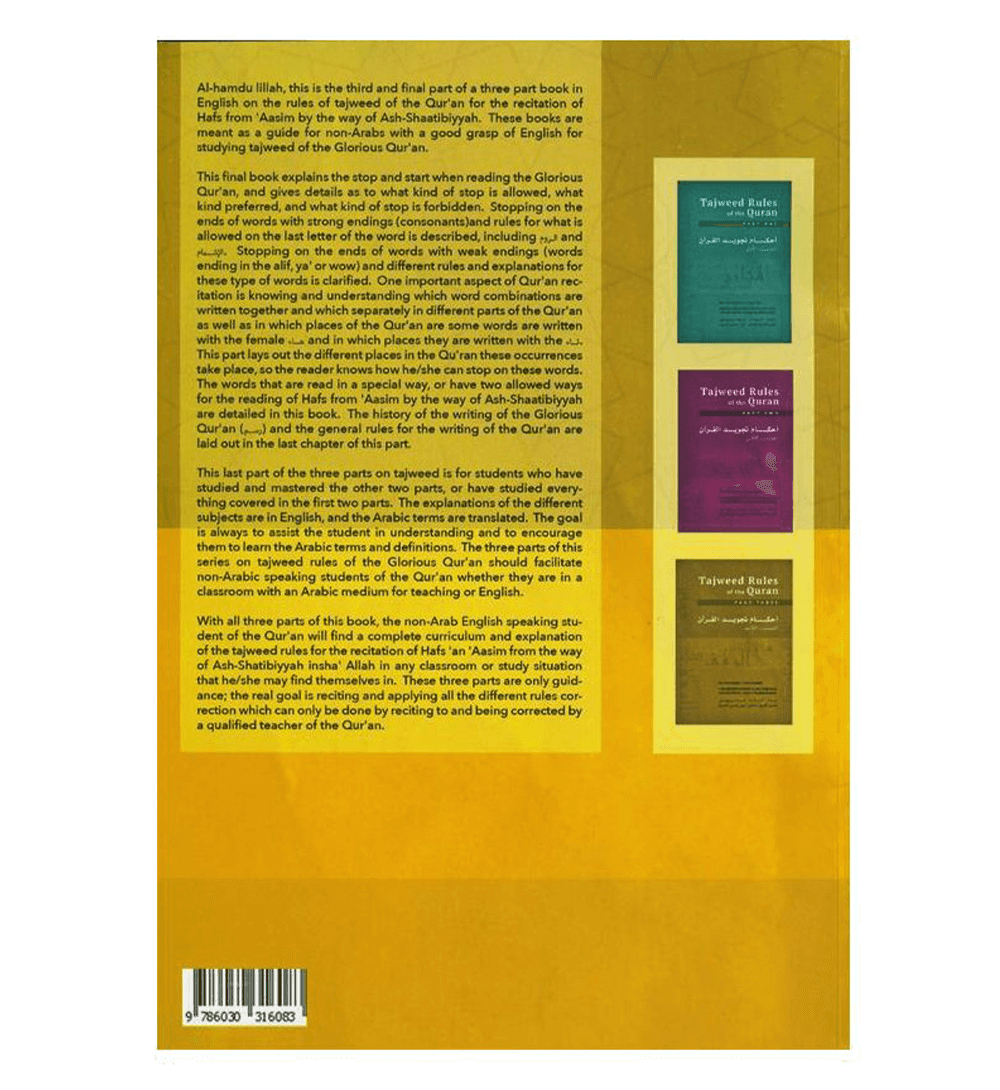 This is the third and final part of a three part series in English on the rules of tajweed the Qur'an for the recitation of Hafs from 'Aasim by the way of Ash-Shaatibiyyah. These books are meant as a guide for non-Arabs with a good grasp of English for studying tajweed of the Glorious Qur'an. This final book explains the stop and start when reading the Glorious Qur'an, and gives details as to what kind of stop is allowed, what kind is preferred, and what kind of stop is forbidden. Stopping on the ends of words with strong endings (consonants) and rules for what is allowed on the last letter of the word is described, including ar-room (الروم) and al-ishmaam (الإشمام). Stopping on the ends of words with weak endings (words ending in the alif, ya' or wow) and different rules and explanations for these type of words is clarified. One important aspect of Qur'an recitation is knowing and understanding which word combinations are written together and which separately in different parts of the Qur'an as well as in which places of the Qur'an are some words are written the female haa (هاء), and in which places they are written with the taa (تاء). This part lays out the different places in the Qur’an these occurrences take place, so the reader knows how he/she can stop on these words. The words that are read in a special way, or have two allowed ways for the reading of Hafs from 'Aasim by the way of Ash-Shaatibiyyah are detailed in this book. The history of the writing of the Glorious Qur'an (رسم) and the general rules for the writing of the Qur'an are laid out in the last chapter of this part. This last part of the three parts on tajweed is for students who have studied and mastered the other two parts, or have studied everything covered in the first two parts. The explanations of the different subjects are in English, and the Arabic terms are translated. The goal is always to assist the students in understanding and to encourage them to learn the Arabic terms and definitions. The three parts of this series on tajweed rules of the Glorious Qur'an should facilitate non-Arabic speaking students of the Qur’an whether they are in a classroom with an Arabic medium for teaching or English. With this third part completed, insha' Allah the non-Arab English speaking student of the Qur'an will find a complete curriculum and explanation of the tajweed rules for the recitation of Hafs 'an 'Aasim from the way of Ash-Shatibiyyah in any classroom or study situation that he/she may find themselves in. These three parts are only guidance; the real goal is reciting and applying all the different rules correction which can only be done by reciting to and being corrected by a qualified teacher of the Qur’an.