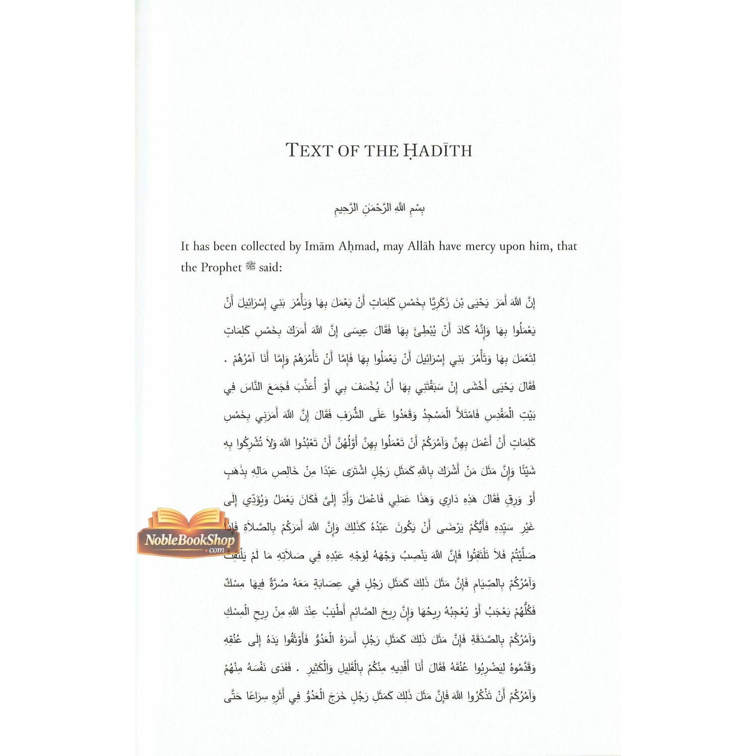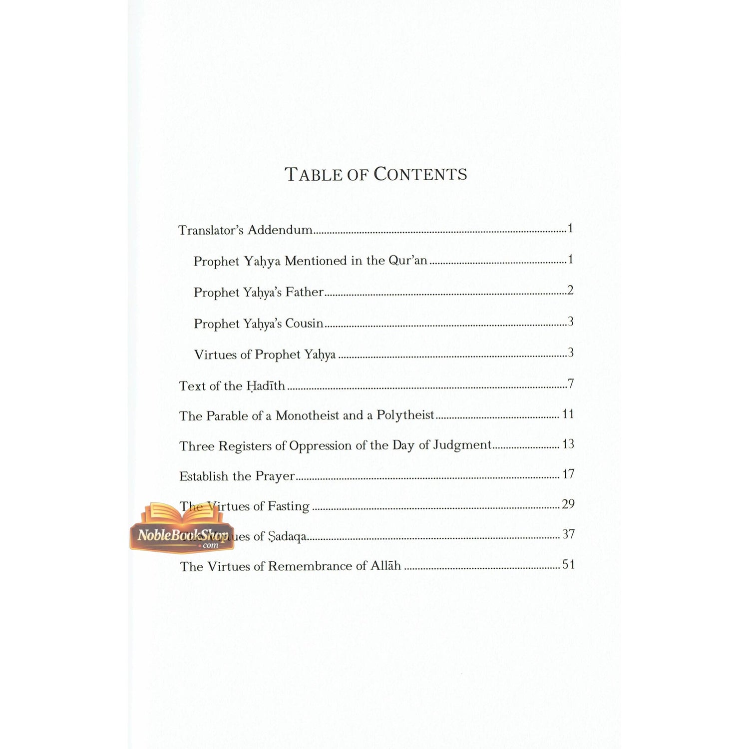 Prophet Yahya, peace be upon him, gathered the Children of Israel in Jerusalem; until they filled the masjid to capacity, sitting upon its balconies. He addressed them, saying, "Indeed Allah has commanded me with five commandments to implement, and He instructed me to command you to implement them as well."