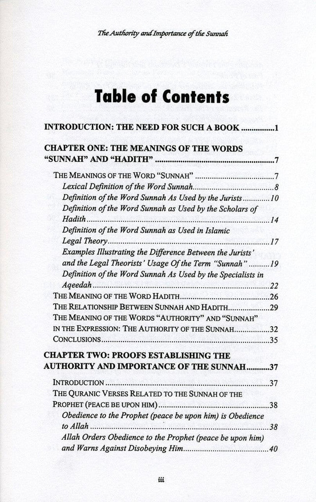The word sunnah; is defined in detailed as it is used by scholars of different disciplines. The authority and importance of the sunnah is determined via a discussion of about fifty verses of the Quran. The roles of the Messenger of Allah (peace be upon him) and the indispensability of his sunnah are clearly spelled out. The position of the sunnah vis-à-vis the Quran is dealt with in detail, demonstrating that the two go hand in hand as the foundation of Islam. Allah's promise to preserve the sunnah and the ways and means by which the sunnah was preserved is also discussed. The ruling concerning one who denies the place of the sunnah of the Prophet (peace be upon him) is given. It is shown herein that the sunnah; which is the true implementation of the Quran; is the only real version and way of Islam. The final chapter discusses the real meaning of adhering to the sunnah; as well as a discussion of what a commitment that truly is.