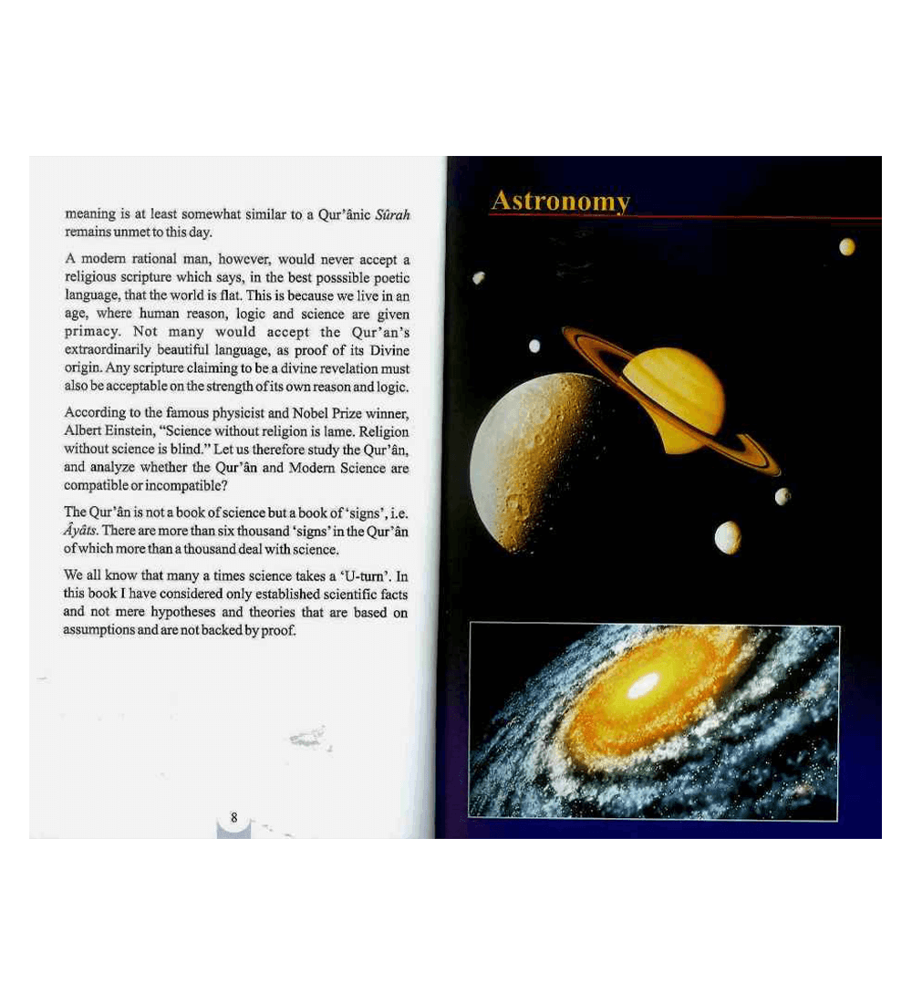 33B Ever since the dawn of human life on this planet, Man has always sought to understand Nature, his own place in the scheme of Creation and the purpose of Life itself. In this quest for Truth, spanning many centuries and diverse civilizations, organized religion has shaped human life and determined to a large extent, the course of history. While some religions have been based on books, claimed by their adherents to be divinely inspired, others have relied solely on human experience. Al-Qur'an, the main source of the Islamic faith, is a book believed by Muslims, to be of completely Divine origin. Muslims also believe that it contains Divine guidance for all humankind. Since the message of the Qur'an is believed to be for all times, it should be relevant to every age. Does the Qur'an pass this test? In this booklet, I intend to give an objective analysis of the Muslim belief regarding the Divine origin of the Qur'an, in the light of established scientific discoveries. There was a time, in the history of world civilization, when 'miracles', or what was perceived to be a miracle, took precedence over human reason and logic. But how do we define the term 'miracle'? A miracle is anything that takes place out of the normal course of life and for which humankind has no explanation. However, we must be careful before we accept something as a miracle. An article in `The Times of India', Mumbai, in 1993 reported that 'a saint' by the name 'Baba Pilot' claimed to have stayed continuously submerged under water in a tank for three consecutive days and nights. However, when reporters wanted to examine the base of the tank of water where he claimed to have performed this 'miraculous' feat, he refused to let them do so. He argued by asking as to how one could examine the womb of a mother that gives birth to a child. The `Baba' was hiding something. It as a gimmick simply to gain publicity.