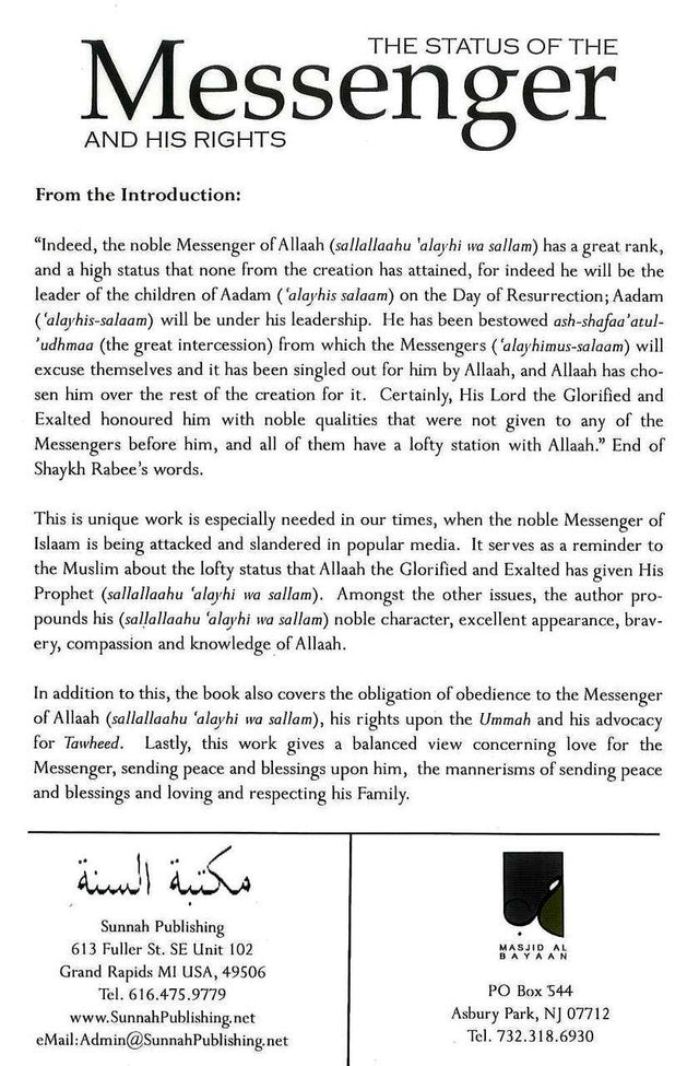 10B This unique work is especially needed in our times, when the noble Messenger صلی الله علیه آله وسلم of Islam is being attacked and slandered in popular media. It also serves as a reminder to the Muslim about the lofty status that ALLAH the Glorified and Exalted has given His Prophet صلی الله علیه آله وسلم. Amongst other issues, the author propounds His صلی الله علیه آله وسلم noble character, excellent appearance, bravery, compassion and knowledge of ALLAH.