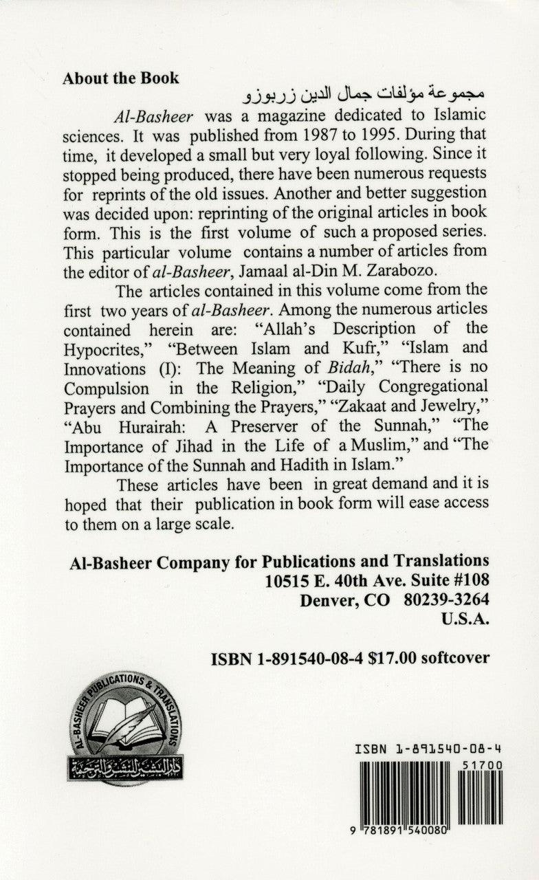 Collected Writings from the Archives of Al-Basheer, the Magazine From the back cover: Al-Basheer was a magazine dedicated to Islamic sciences. It was published from 1987 to 1995. During that time, it developed a small but very loyal following. Since it stopped being produced, there have been numerous requests for reprints of the old issues. Another and better suggestion was decided upon: reprinting of the original articles in book form. This is the first volume of such a proposed series. This particular volume contains a number of articles from the editor of al-Basheer, Jaal al-Din Zarabozo. The articles contained in this volume come from the first two years of al-Basheer. Among the numerous articles contained herein are: - Allah's Description of the Hypocrites, Between Islam and Kufr, Islam and Innovations. - The Meaning of Bidah. - There is no Compulsion in the Religion. - Daily Congregational Prayers and Combining the Prayers./ - Zakaat and Jewelry. - Preserver of the Sunnah. - The Importance of Jihad in the Life of a Muslim. - The Importance of the Sunnah and Hadith in Islam. These articles have been in great demand and it is hoped that their publication in book form will ease access to them on a large scale.