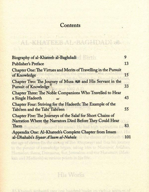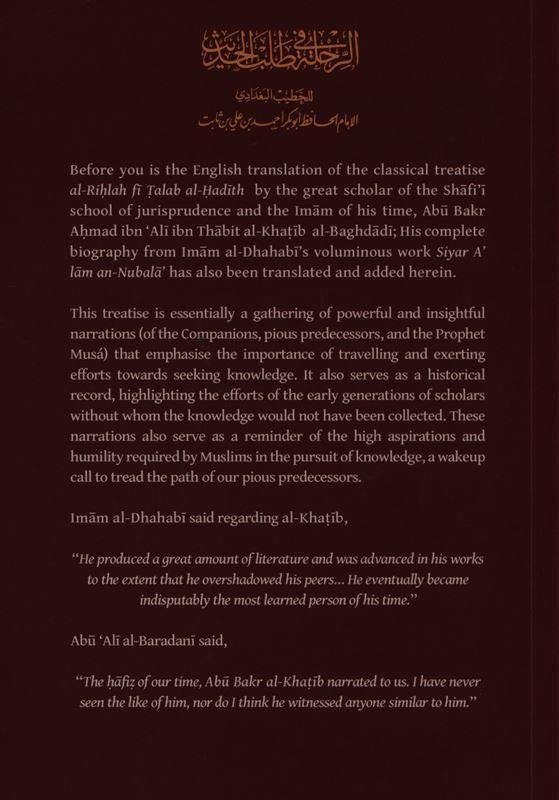 Before you is the English translation of the classical treatise al-Rihla fi Talab al-Hadeeth by the great scholar of the Shafi’i school of jurisprudence and the imam of his time, Khateeb al-Baghdadi. His complete biography from Imam al-Dhahabi’s voluminous work Siyaar A’laam al-Nubala has also been translated and added herein. This treatise is essentially a gathering of powerful and insightful narrations (of the Companions, pious predecessors, and the Prophet Musa) that emphasise the importance of travelling and exerting efforts towards seeking knowledge. It also serves as a historical record, highlighting the efforts of the early generations of scholars without whom the knowledge would not have been collected. These narrations also serve as a reminder of the high aspirations and humility required by Muslims in the pursuit of knowledge, a wakeup call to tread the path of our pious predecessors. Imam al-Dhahabi said regarding al-Khateeb, He produced a great amount of literature and was advanced in his works to the extent that he overshadowed his peers… He eventually became indisputably the most learned person of his time. Abu ‘Alī al-Baradani said, The hafiz of our time, Abu Bakr al-Khateeb narrated to us. I have never seen the like of him, nor do I think he witnessed anyone similar to him. was born.