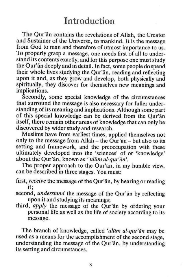 The Qur'an contains the revelations of Allah, the Creator and Sustainer of the Universe, to mankind. It is the message from God to man and therefore of utmost importance to us. To properly grasp a message, one needs first of all to under- stand its contents exactly, and for this purpose one must study the Qur'an deeply and in detail. In fact, some people do spend their whole lives studying the Qur'an, reading and reflecting upon it and, as they grow and develop, both physically and spiritually, they discover for themselves new meanings and implications. Secondly, some special knowledge of the circumstances that surround the message is also necessary for fuller under- standing of its meaning and implications. Although some part of this special knowledge can be derived from the Qur'an itself, there remain other areas of knowledge that can only be discovered by wider study and research. Muslims have from earliest times, applied themselves not only to the message from Allah - the Qur'an - but also to its setting and framework, and the preoccupation with these ultimately developed into the 'sciences' of or 'knowledge' about the Qur'an, known as "ulum al-qur'an'.