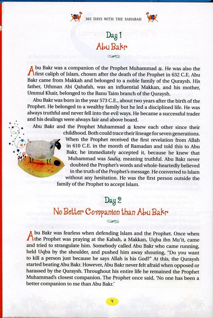 00000 365 Days with the Sahabah is a unique storybook, which takes children on a fun-filled, day-by-day adventure throughout the life and times of the Sahabah or the Companions of the Prophet Muhammad. It provides a lively account of the Sahabah as persons, whose life and teachings are loved, cherished and respected by people all over the world. Every day, children will find in it a new story enshrining the wisdom of the Prophet Muhammad and his Companions, which they can apply in their daily lives. Featuring 365 stories, this book introduces children to wonderful world of the Sahabah and the Prophet Muhammad. Children will love the colourful illustrations and captivating stories, charmingly told in simple language.