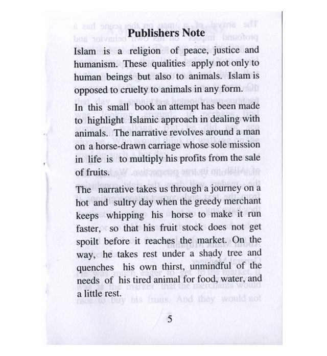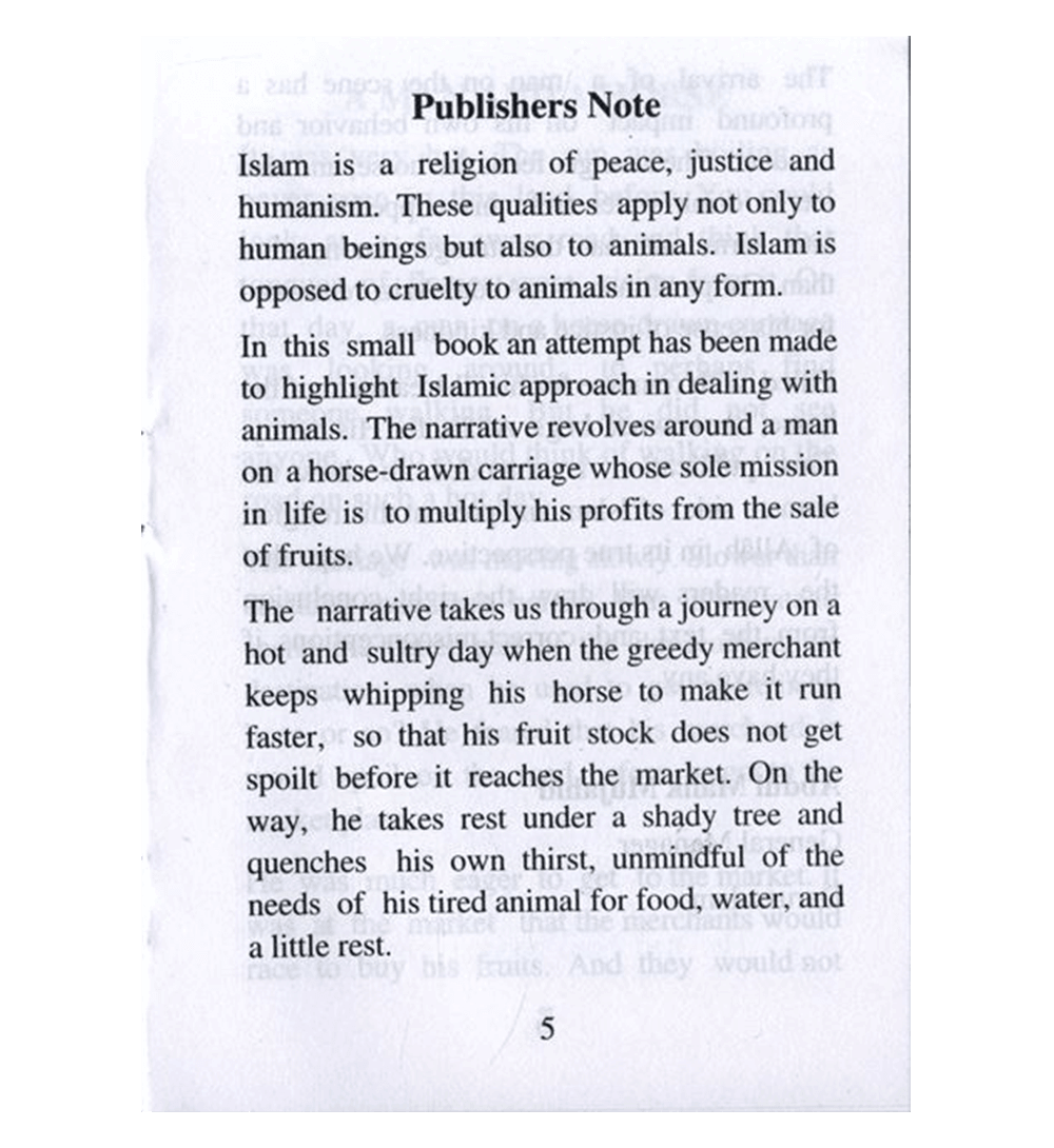 19B In this small book an attempt has been made to highlight the Islamic approach in dealing with animals. The narrative revolves around a man on a horse-drawn carriage whose sole mission in life is to multiply his profits from the sale of fruits. The author has intended show the human side of Islam and present this religion of Allah in its true perspective