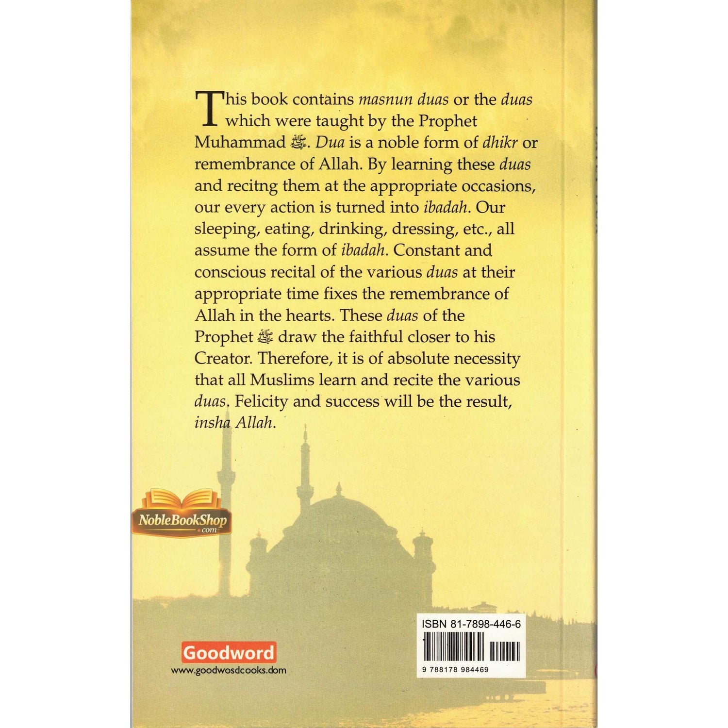 - About 82 Important Readings - From Ta-aw-wuth - Kalimah / Basic Tetaments of Belief - Adhaan - Duas for Salaat (Prayers During Salah) - Daily Dua's - Janazah (Funeral Prayer) and Other Duas - Clearly presented and Easy to read - Recommended for Primary Madrassahs and New Muslims to Read Arabic Properly This book contains masnun duas or the duas which were taught by the Prophet Muhammad S.A.W.W. Dua is a noble form of dhikr or remembrance of Allah. By learning these daus and recitng them at the appropriate occasions, our every action is turned into ibadah. Our sleeping, eating, drinking, dressing, etc, all assume the form of ibadah. Constant and conscious recital of the various duas at their appropriate time fixes the remembrance of ALLAH in the hearts. These duas of the Prophet draw the faithful closer to his Creator. Therefore, it is of absolute necessity that all Muslims learn and recite the various duas. Felicity and success will be the result, insha Allah.